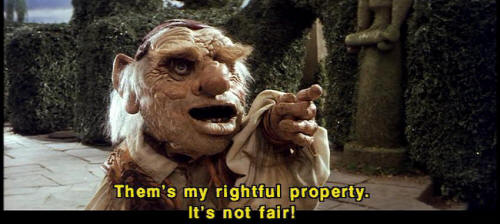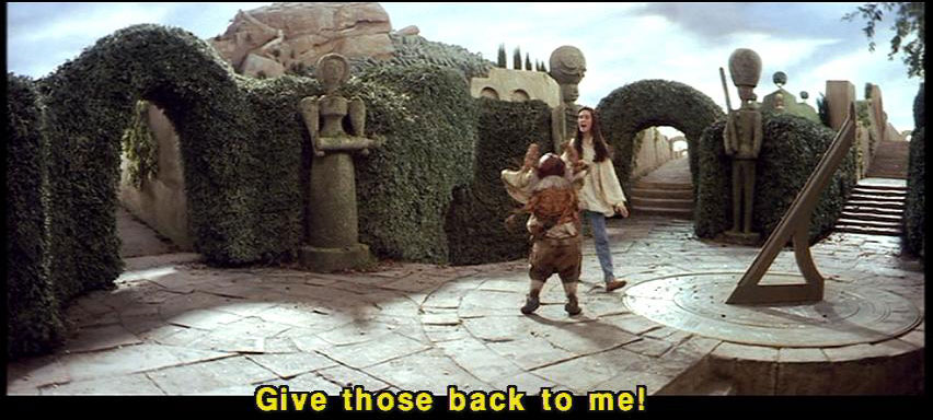 [Hoggle] Don't try to embarrass me. I've got not pride. [Sarah] Oh, yeah? [Hoggle] But them's my jewels! [Hoggle] You give 'em back. Give them back. Give those back. [Hoggle] Give those back to me! [Sarah] Now, there's the castle. Which way should we try? [Them's my rightful property. It's not fair! [Sarah] No, it isn't. |