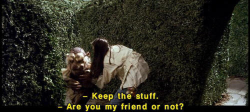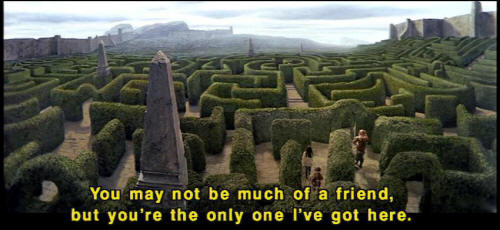 [Sarah] Because you are. [Sarah] You may not be much of a friend, but you're the only one I've got here. [Sarah] Do you hear something? [Sarah] No, it's all right. [Hoggle] Friend. [Hoggle] I like that. [Hoggle] I ain't never been no one's friend before. [Hoggle] Good-bye! [Sarah] Wait a minute. [Hoggle] Keep the stuff. [Sarah] Are you my friend or not? |