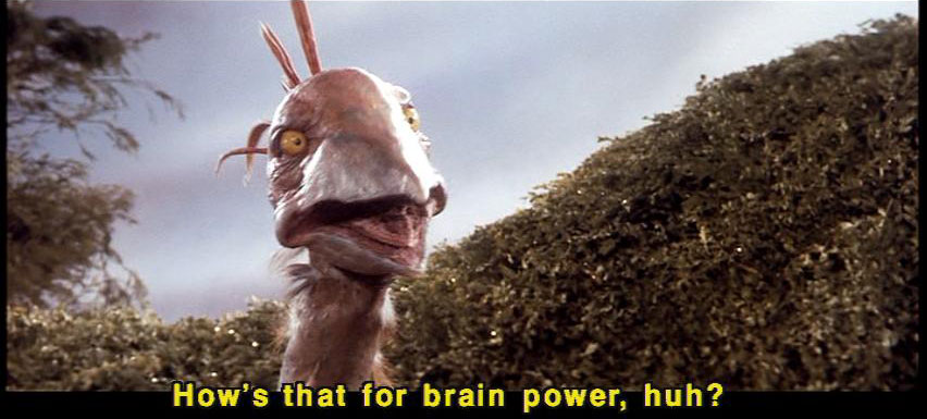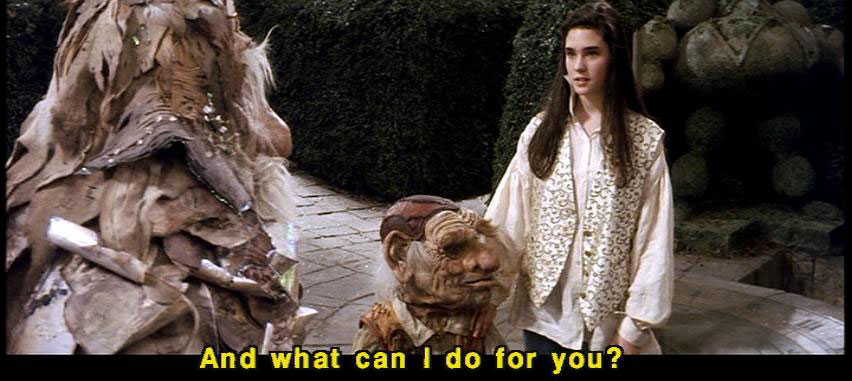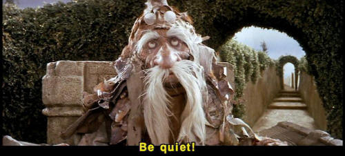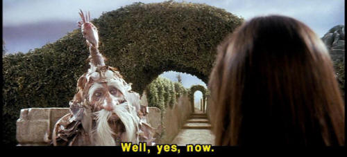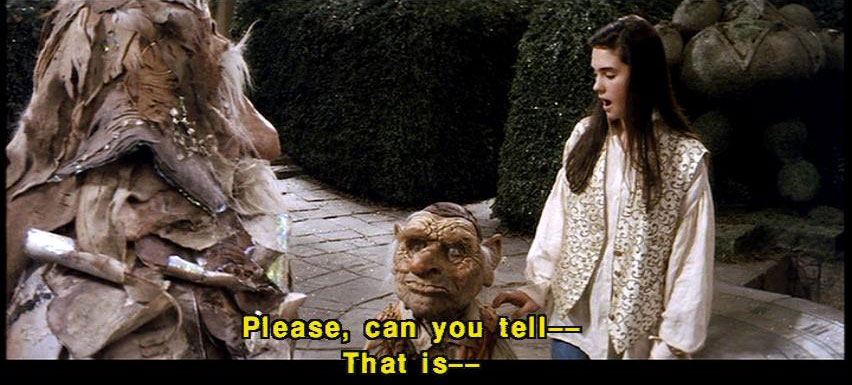 [Guru] And what can I do for you? [Sarah] Please, can you tell -- That is -- [Sarah] I have to get to the castle at the center of the labyrinth. [Sarah] Do you know the way? [Guru] Well, yes, now. [Guru] You want to get to the castle. [Hat] How's that for brain power, huh? [Guru] Be quiet! [Hat] Ah, nuts.
