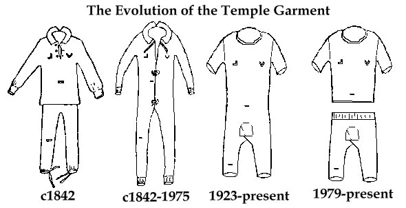 Below appears a list of the temple clothes. It should be noted that at certain stages of the endowment, participants are required to change their robes and caps from the left side of the body to the right side (the girdles are worn opposite the robe). This indicates a transition from officiating in the ordinances of the lower, or Aaronic Priesthood, to the higher, or Melchizedek Priesthood. Articles Necessary for Temple Endowment Work (This includes articles worn by couple at time of marriage) For men: White Robe (worn over the shoulder) For women: White Robe (worn over the shoulder) Below is a picture of the temple clothing from an old exposure of the endowment called "Lifting the Vail." It was published in The Daily Tribune (Salt Lake City, Utah), Sunday September 28, 1879. It shows the "old style" garment, a robe, a cap, an apron and a woman's veil (the head is placed in the hole, the diamond-shaped part hangs down the back, and the two strings are tied beneath the chin).