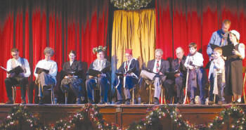 In November, the Music Department presented the SVU Flute Choir in concert, directed by Professor Launa Whitehead. The performance featured music from Rodgers & Hammerstien's The Sound of Music, Floris Suite by Catherine McMichael, Mozart's Ave Verum Corpus, and Alexander's Ragtime Band by Irving Berlin. Students played a variety of flutes, from the dainty piccolo, to the elegant alto flute, to the massive bass flute. The concert delighted those in attendance with inspiring and invigorating music. SVU's Chamber Choir, directed by Dr. Keith Bradshaw, performed at the Christmas Lighting ceremony at the Washington, D.C. Temple SVU's Chamber Choir was busy in December as they began the month with a trip to Kennsington, MD. The choir was one of the fortunate performing groups invited to share their talents during the Christmas lighting ceremony at the Washington, D.C. Temple. Under the direction of Dr. Keith Bradshaw, students sang for thousands of people from around the world who gathered for the Temple's annual tradition. Later in the month, the Chamber Choir held its annual Christmas Concert in Chandler Hall. Community members, staff, faculty, and families came to take part in the festive celebration. The staff party reading of A Christmas Carol (from left to right): Paul Wright -- Narrator; David Dwyer -- Jacob Marley; Morgen Reynolds -- Ghosts of Christmas Past & Future; Keith Bradshaw -- Ghost of Christmas Present; Robert Stoddard -- Ebenezer Scrooge; Robert Huch & Richard Whitehead -- Collectors for the Poor; Nathan Dransfield -- Tiny Time; Scott Dransfield -- Bob Cratchit; Gavin Dransfield -- Peter Cratchit; Andrea Dransfield -- Mrs. Cratchit To wrap up the season, SVU employees were treated to a staged abridged reading of A Christmas Carol, by Charles Dickens. The reading took place during the staff Christmas party, which was Victorian themed and organized by English Professor Carrie Brotherson and members of the SVU Women's Society. Staff, faculty, and even children joined their talents together for a rich performance filled with the Christmas Spirit. CHAMPION KNIGHTS This fall, Southern Virginia's valiant Knights claimed the school's 22nd and 23rd National Championships: one for women's Cross-Country and one for women's Soccer.