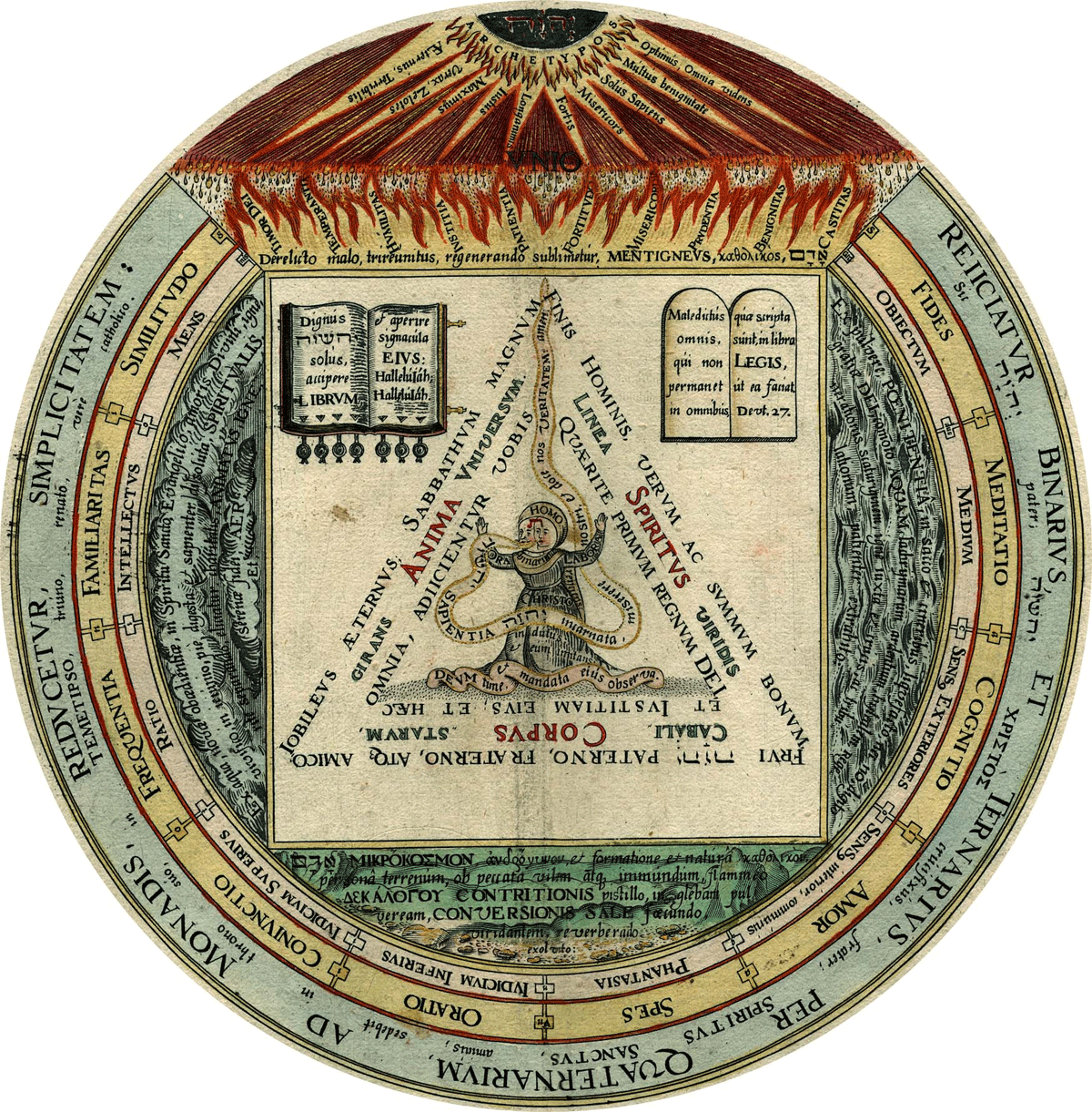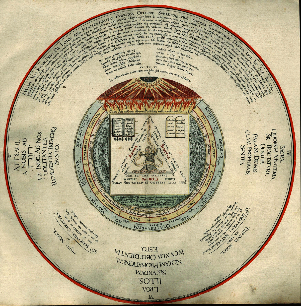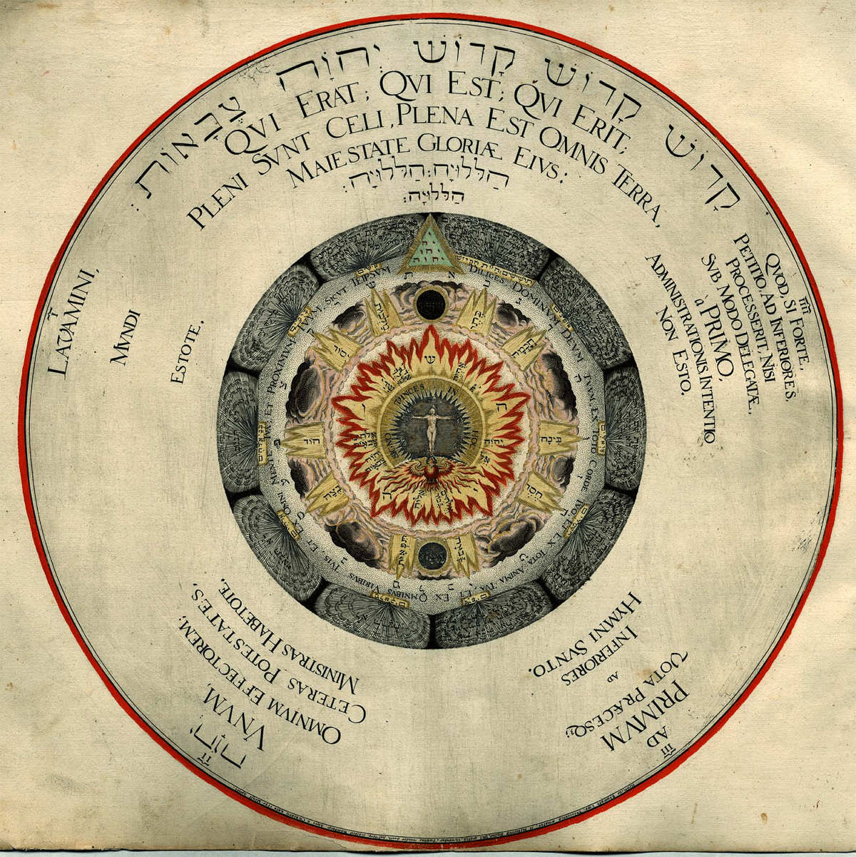 2. Quemadmodum bonorum mundanorum pars decima solet impendi Deo, in causis piis; nouem uero usui mundano: ita, in contrario, Theosophum decet, decimam dumtaxat Lapidis huius partem, usibus impendere munandis, nouem uero reliquas soli Deo, in proximo, egeno. Quod eleemosynarii Dei, in hospitali hoc magno, est proprium. Sigillum naturae et artis, simplicitas. [Google translate: As part of the tenth of worldly goods is usually expended to God, in cases pious; nine worldly use, but I will now, in the opposite, THEOSOPHY fitting, only the tenth part of this stone, to expend munandis uses, and nine, however, the rest to God alone, in the next, the needy. That eleemosynarii of God, in this great hospital, is a property. Seal of nature and art, the simplicity.] Dixi. [Google translate: I said.] Henricus Khunrath Lips. Theosophiae amator, et Medicinae Doctor, Dei gratia, inuentor, Paullus uander Doort [Paulus vander Doort], Antverpien, scalpsit, Hamburgi, Anno a Christo nato 1595. Mense Iulio. [Google translate: Henry Khunrath Boston. Theosophiae a lover, Doctor and medicine, the grace of God, the inventor, Paullus uander Door [Paul Vander Door], Antverpien, scalpsit, Hamburg, in the year 1595 from the birth of Christ. In July.] _______________ Notes [1] Cf. Tac. Ann. 15.12. [2] Tetragammon. [3] Editions of 1595 and 1653: terreo. [4] Cf. Verg. Aen. 1.26. The four, the three, the two, the one Surrounding the circular image of the the Four, the Three, the Two, the One is engraved text. Decebit nos, igitur, prius pie lotos atque paenitentialiter purgatos, offerre, supplicesque, fide sincera, commendare deificae luci, et tunc, illam sapientiae aeternae, desuper rorantem mannam, supercaelestisque nectaream, et aquae et ignis, pluuiam, sicut stillicidia stillantia super terram, in corda, animas, uires mentesque nostras, hoc est in corpus, spiritum et animam, siue ternarium Microcosmicon renatum, descendentem, praeclusis sensibus seditiosis, mente quieta affectuque omni puro, fixe durantibus, tam immediate quam mediate, iuxta et dormientes ac uigilantes, patienter expectare; et sic, diuinitus, accendi; illustrari; illuminari; sanctificari; yhvh[1] frui; diuina pati; immo, in Deum, ineffabiliter, rapi; et quasi deificari. Laudantes interdum et adorantes (in soliloquiis, praesertim, iisque quotidianis, ut plurimum, matutinis) id pelagus misericordiae immensum, oceanuumque bonitatis omnis infinitum; ex quo, non tantum uerbi mirifici yehoshua Christou crucifixi, et sacrorum yhvh nominum atque uerborum omnium (quae, quoad nos, mansiones sunt sensibiles Diuinitatis, nec non memoracula nos docentia: stimulantia quoque, adiuuantia et eleuantia appetitum animae, mentisque, in nobis, operationem admirandam, in nosmet ipsos et extra nos, uirtuose promouentia) numen designantium et simul exhibentium; uerum etiam mirabilium omnium (facit enim yhvh mirabilia solus) ad nos usque deriuantur radii, destillant fluenta, et diuinissimi emanant riui. O felix terque quaterque felix, in admirationem, meditationem, amorem et perceptionem horum, qui rapitur. Numen, sic, summum, realiter praesens sentiemus; yhvh mirabilem, et in nobis, et in natura, et in scriptura, mirifice loquentem, ueridice audiemus, sufficienter uidebimus, fructuose obseruabimus; angelos bonos, nobis amice assistentes, nos fideliter monentes. yhvh iussu benigno familiariter docentes, atque in uiis nostris tuto ducentes, sine fallacia experiemur. Humi, igitur, procidentibus nobis, hic hymnus, aliique huic non ab similes, Ionico modulamine et accentu, sacris animi concitandi causa, debito, proferendus est: [Google translate: Decebit us, therefore, before, and having washed them with godly paenitentialiter cleared, to offer, as suppliants, sincere faith, to commend the deifying light, and at that time, that of eternal wisdom, the dripping manna from above, supercaelestisque nectar, and water and fire, rain, a drop stillantia upon the earth, in the hearts, souls, and minds of our strength, that is into the body, the spirit and the soul, or three Microcosmicon born again, coming down, shut seditious senses, all with a pure mind and feeling quiet, fixedly during its course, both immediately and mediately, in accordance with, and watching and sleeping, patiently to wait on and so, divinely, lighted; illustrated; enlightened, sanctified; yhvh to enjoy; to suffer divine things, for one, against God, ineffably, steal, and as it were, deified. Sometimes in praise and those who worship (in the soliloquies, especially, and those daily, for the most part, rising in the morning) that the main mercy immense, oceanuumque all infinite goodness, from which, not only of the word wonderfully yehoshua Christou crucified, and the sacred words, and names of all yhvh (which, as long as us, are sensible mansions of divinity, nor the teacher does not memoracula us: the instigation of, too, and help eleuantia appetite of the soul, the mind, in us, admire the operation, in ourselves and outside of us, virtuous promouentia) designating and divinity are presenting at the same time, but also of all wonders (yhvh wonderful things for it makes us the only) to us in the deriuantur rays, destillant streams, and streams of the divine they emanate. O happy thrice and four times happy, in admiration, meditation, love and perception of these, who is carried away. Deity, thus, the summit, the feel is really present; yhvh wonderful, and in us, and in nature and in writing, speaking wonderfully, we will hear ueridice sufficiently we shall see, have benefited from obseruabimus; the good angels, to us, Friend, assistants, who warns us faithfully. yhvh by order of a familiar kind, teaching, and leading safety in our streets, without the deceitfulness of experience. On the ground, therefore, they fell to us, the same hymn, not from this and other similar, Ionic accent and music, to inspire the mind the sacred cause, due to utter is:] Rei omnis generatorque opifexque, [Google translate: Generatorque opif