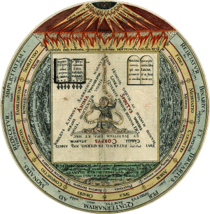 Alchemist's Laboratory Surrounding the circular image of the alchemist's laboratory and oratory is engraved text. Homo toto corde, tota anima, omnibus uiribus, et omni mente, diuina gratia stimulante et mouente, (est enim Dei misericordis donum) studens yhvh[1] agnoscere, se ipsum (cognitione sui) abnegare, et mundum (cognitione quoque luminis naturae) contemnere immundum: [Google translate: A man with his whole heart, whole soul, with all our strength, and to every mind, by divine grace and the instigation of moves, (for it is the gift of God most merciful) yhvh striving to acknowledge himself (knowledge of) to deny, and the world (also light the knowledge of nature) unclean to despise:] 1. Stola integritatis Christianae candida, hoc est simplicitate, recto et probitate, sancte amictus; ueritatisque diuinae zona lumbis succinctus aurea, et sceptro Christianae libertatis imperatorio, mundo uidelicet, diabolo ac carnis concupiscentiis atque affectibus dominando, in hanc scenam mundanam progrediens. [Google translate: Integrity of the Christian white robe, that is simplicity, the nominative case and integrity, of the holy attire; girded about the loins with a girdle of gold ueritatisque divine, Christian liberty, scepter, and the empire, namely the world, the devil and the lusts of the flesh and emotions sway, on this worldly stage to proceed further. 2. Anulo assistentiae gratiae Diuinae admonitorio, uirtuosae uidelicet catholicaeque promissionis, ab ipso, in cuius ore non inuentus fuit dolus, datae, dicentis, Amen, amen dico uobis, si quid petieritis Patrem in nomine meo, dabit uobis, petite et accipietis: digito anulari decoratus. [Google translate: Ring insurance admonitorio to divine grace, namely virtuous catholicaeque of promise, by him, in whose mouth was no guile was found, given to them, saying, Verily, verily, I say unto you, Whatsoever ye shall ask the Father in my name, will give you, ask and you shall receive: the finger with the RING-MAKER.] 3. T, uere catholici signatura, mitrae, aut laminae aureae sacerdotalis, coronaeue regiae loco, hominis interioris fronte, diuinitus notatus, et ceu obtectus atque ornatus. [Google translate: T, truly Catholic Signatura, bonnets, with plates of gold, or priestly, royal coronaeue place, the inner man, the forehead, divinely noted, and as covered by its treasures and ornaments.] 4. Aqua lachrymarum paenitentialium et nouae oboedientiae benedicta, aspersorio crucis ac tribulationum uere hyssopico, Christiane aspersus. [Google translate: Tears of penance for water and blessed the new obedience, truly hyssopico aspersorio with crosses and tribulations, sprinkled with the Christian.] 5. Cui, ante mentis suae, Deo, coniunctae atque unitae, oculos, e collo dependet, in tabulis cordis sui, a lethiferis peccatorum sordibus puri ac mundi, uere aureis, flagrantissimi amoris Diuini cinabrio, fidei sincerae penicillo indelibiliter depictus, nec non malleo spei firmae fortiter impressus yehoshua Christos, Deus et homo, crucifixus; pentagrammos yhvh tetragrammos ipsissimus character, et figura paternae hypozateôs siue subsisentiae: sigillum Patris, imago non tantum, uel eikôn sed et apaugasma et uerus gloriae Patris splendor, Dei uerbum, Dei uirtus, et Dei sapientia incarnata. En, signaculum, uincens ac fugans partes aduersas! Pentaculum et quinque literarum ac uulnerum, uerbi mirifici mirificum! Almadel uirtuosum! [Google translate: To whom, before the of his mind, God, joined together and united, the eyes, from his neck depends, in the tables of his heart, from the pure filth of sins and the world's lethiferis, truly golden, divine love cinabrio his ardent, sincere faith indelibiliter brush painted, he would not be impaired with the hammer of hope strongly imprinted on yehoshua Christos, God and man, was crucified; pentagrammos yhvh tetragrammos ipsissimus a character, and the figure of his father's or hypozateôs subsisentiae: seal of the Father, not only the image, or eikôn apaugasma and true but also the splendor of the Father of glory, the Word of God, the power of God and of God the wisdom incarnate. Behold, a seal, and scatters uincens parts and adversity! Pentaculum and the wounds and five letters, the word wonderfully wonderful! Almadel virtuous! 6. Circulo yhvh igneo, gladio uerbi Diuini ancipiti, candidae et uiuae fidei in Christum manu, Deo eam mouente et regente, ducto, inclusus eoque contra portas inferni, tutore Elohim Zebaoth omnipotente, inuictissime munitus. [Google translate: Yhvh a fiery circle, two-edged sword of the word divine, bright and living faith in the hand of Christ, and God was governing it moves, drawing, and so shut up against the gates of hell, guardian Almighty Elohim of Hosts, protected by the invincible. 7. Iramentum, ob foedus et pactum conuentionis, cum Spiritu sapientissimo optimo, potentissimo, infinito, zelote, quo ei triuni, se triunum totum corpore, spiritu, et anima, mancipauit, in perpetuum indissolubile, ceremoniis sanctissimis, in baptismate Christiano, iuxta et fluminis lotione sacri aquosa, et flatus unctione sacrosancti oleosa, semel sancte praestitum, fideliter seruans: datamque illi ipsi fidem, qui sanguine eum redemit suo (cui tu, inquam, chirographarius debitor sanguine uicissim obligatus tuo) nefarie non soluens. [Google translate: Iramentum, because of his covenant and the covenant conuentionis, when the Spirit of wisdom and the best, most powerful, the infinite, the Zealot, which triuni him, he triunum the whole body, spirit, and soul, devoted, for ever indissoluble, most holy ceremonies, in the Baptism the Christian, and of the river, according to lotione sacred watery, oily substances and breath of the anointing of the Most Holy, holy once performed, faithfully keeper: datamque, these very men the faith who redeemed him his blood (to whom you, I say, a debtor chirographarius bound to turn your blood) is not unfolding wickedly.