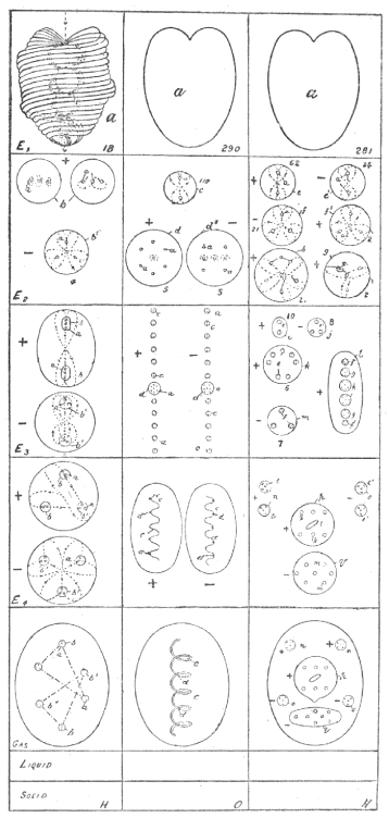 The respective number of ultimate atoms contained in a chemical atom of these two bodies are thus seen to closely correspond with their accepted weight-numbers. It may be said in passing that a chemical atom of ozone appears as an oblate spheroid, with the contained spiral much compressed and widened in the centre; the spiral consists of three snakes, one positive and two negative, formed in a single revolving body. On raising the chemical atom to the next plane, the snake divides into three, each being enclosed in its own egg. The chemical atom of nitrogen was the third selected by the students for examination, as it seemed comparatively quiet in contrast with the ever-excited oxygen. It proved, however, to be the most complicated of all in its internal arrangements, and its quiet was therefore a little deceptive. Most prominent was the balloon-shaped body in the middle, with six smaller bodies in two horizontal rows and one large egg-shaped one in the midst, contained in it. Some chemical atoms were seen in which the internal arrangement of these contained bodies was changed and the two horizontal rows became vertical; this change seemed to be connected with a greater activity of the whole body, but the observations on this head are too incomplete to be reliable. The balloon-shaped body is positive, and is apparently drawn downwards towards the negative egg-shaped body below it, containing seven smaller particles. In addition to these large bodies, four small ones are seen, two positive and two negative, the positive containing five and the negative four minuter spots. On raising the gaseous atom to E 4, the falling away of the wall sets free the six contained bodies, and both the balloon and the egg round themselves, apparently with the removal of their propinquity, as though they had exercised over each other some attractive influence. The smaller bodies within the egg—marked q on E 4—are not on one plane, and those within n and o form respectively square-based and triangular-based pyramids. On raising all these bodies to E 3 we find the walls fall away as usual, and the contents of each "cell" are set free: p of E 4 contains six small bodies marked k, and these are shown in k of E 3, as containing each seven little bodies—marked e—each of which has within it two ultimate atoms; the long form of p E 4—marked l—appears as the long form l on E 3, and this has three pairs of smaller bodies within it, f', g and h, containing respectively three, four and six ultimate atoms; q of E 4, with its seven contained particles, m, has three particles m on E 3, each showing three ultimate atoms within them; e from n of E 4 becomes i of E 3, with contained bodies, e, showing two ultimate atoms in each; while e' from o of E 4 becomes j of E 3, each having three smaller bodies within it, e', with two ultimate atoms in each. On E 2, the arrangement of these ultimate atoms is shown, and the pairs, f', g and h are seen with the lines of force indicated; the triads in f—from m of E 3—are similarly shown, and the duads in e and e'—from i and j of E 3—are given in the same way. When all these bodies are raised to E 1, the ultimate physical atoms are set free, identical, of course, with that previously described. Reckoning up the number of ultimate physical atoms in a chemical atom of nitrogen we find they amount to 261, thus divided:—