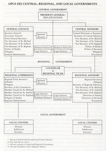 Central Government -- Encarnita Ortega The surprise was indescribable. None of us expected this. He said to me personally: "We are giving you two jobs so that you can carry the weight better like a good little donkey." He also announced that as Encarnita would now be the central directress, Begona Mujica, a numerary from Bilbao who had been in the central government in Spain and had arrived a few months earlier at the Villa Sacchetti administration, would now direct that administration. The directress of the region of Spain would be Crucita Taberner. This central advisory, together with Monsignor Escriva, the Father, Father Antonio Perez-Tenessa as the priest secretary general, Don Alvaro del Portillo as procurator general, Father Jose Maria Hernandez-Garnica as priest central secretary, formed the worldwide central government for the Opus Dei Women's Branch. Both Monsignor Escriva (who also belonged to the general council or Men's Branch central government) and the other priests who were part of the central advisory all had a full vote and some of them a veto. The only one of them who resided in Rome, besides Monsignor Escriva, was Alvaro del Portillo. The others continued in Spain where the general council for the Opus Dei Men's Branch was still located. According to Opus Dei's Constitutions, responsibilities of these posts are as follows: the central advisory directress under the guidance of the president general and the central priest secretary devotes her efforts to the overall leadership of the Women's Branch. The secretary of the central advisory distributes tasks among the vice secretaries and other government members and supervises the faithful fulfillment of their obligations. She replaces the central secretary (or directress) in case of absence or incapacity, and prepares the official minutes of the central advisory meetings. The vice secretary of St. Michael has responsibility for the formation of all Opus Dei female numeraries and associates in any country where there are members of the Work as well as to further any activity related to these members. The vice secretary of St. Gabriel has responsibility for everything that concerns supernumeraries and cooperators worldwide, both their formation and activities. The vice secretary of St. Raphael has as her charge the apostolate and proselytism of young people in all Opus Dei houses worldwide as well as to further any kind of activity that leads to an increase in vocations or work with youth. The prefect of studies has charge of all those matters that refer to education, whether spiritual or intellectual, of ordinary numerary women. The prefect of servants has charge of the religious and professional formation of servant numeraries. The delegates' mission is to study problems of their respective regions. They represent the country within the central advisory and in the regional governments they rank immediately after the regional directress and have a vote and veto power in the respective women's regional advisory. Every five years, the central procurator must inspect the account books of every region herself or by representative, in order to correct any defects and faithfully implement norms set out by the institute's general administration. Each quarter she will receive from the regional procurators statements of accounts, which must be submitted to the scrutiny of the central directress and the advisory. The term of these positions is five years. To facilitate understanding of the government of Opus Dei, I include a diagram on the following page. OPUS DEI CENTRAL, REGIONAL, AND LOCAL GOVERNMENTS During all the years in which I was part of the Opus Dei government, it was officially collegial but in practice acted at the pleasure of the Founder. To put it more politely, the government was a "directed democracy." Let me give an example: Monsignor Escriva decided that it was necessary to give major impetus to the region of Colombia and that it would be good to send one of the numeraries then on the central advisory. Summoning Encarnita and myself, he asked us how we felt about assigning Pilar Salcedo to Colombia as regional directress to replace Josefina de Miguel, who had begun the foundation of Opus Dei women in that country. Although Pilar Salcedo then held the position of prefect of studies on the central advisory, we immediately answered that it seemed a very good idea to us. On the spot Monsignor Escriva had us call Pilar to the Villa dining room. When Pilar appeared, the Father spoke to her very affectionately, saying that he wanted her to take on the important task of regional directress for Colombia, but that it was up to her to decide. He overwhelmed her with all kinds of flattery: "You know, daughter, what confidence I have in you," "I know you will do good work there, because you have spent time close to me and know how deeply the Father loves his daughters." Pilar turned red at the news, but was deeply moved by "the confidence the Father was placing in her." Naturally, she agreed to go to Colombia. Monsignor Escriva immediately called a meeting of the central advisory for that afternoon "to tell the others." When the whole central government gathered with Monsignor Escriva and Don Alvaro del Portillo in the Villa Vecchia dining room, the Father said that he had called us together to let us know that Pilar Salcedo would leave for Colombia in a few days. Praising that country, Monsignor Escriva pronounced a sentence that became famous within Opus Dei over the years: "Colombia, my daughter, is the country of emeralds. But the best emeralds are my daughters, if they are faithful to me" (si me son fieles). It is worth stressing that when Monsignor Escriva spoke about fidelity, he frequently used sentences such as "If you are faithful to me," "Be faithful to me." That is to say, I never heard him say, "Be faithful to the church." He always seemed to be more concerned with fidelity to himself than what was due God. Returni