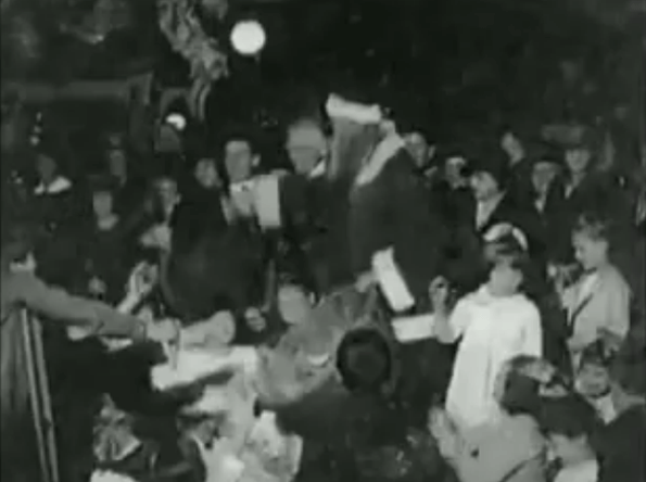 [Alan Dundes, Folklore Dept., U.C. Berkeley] Clement Moore was a minister. Here, a minister, who should be on the other side, is promoting a secular Christmas, with reindeer and all of the rest of it. But there was no mention in the poem of anything religious. In fact, that's why he didn't reveal who he was. In the beginning, he didn't reveal the authorship. [Narrator] Moore soon owned up to the poem when it became clear that every child in America was scanning the horizon for reindeer on Christmas eve. Less clear was what exactly this Santa Claus looked like. At first, Santa came in all shapes and sizes: a pagan sorcerer; a frightening gnome; even a drunkard on a turkey-driven sleigh. Then in 1863, Thomas Nast, a cartoonist for Harper's Weekly, settled the matter once and for all with his version of the Christmas Saint. Nast's Santa was rounder and jollier than his austere Catholic cousin. He looked, in fact, like a man of his times, a man who would fit right in with the rotund, bewhiskered robber-barons of the late 19th century. But Santa was a robber-baron in reverse. [Penne L. Restad, Historian, Univ. of Texas] Instead of taking from the less fortunate, he gave to the less fortunate. He gave to people regardless of whether they had done something or not. In other words, he gave to children. Instead of gathering together wealth, he gets rid of wealth, and he does it yearly. [Narrator] A captain of industry with a heart of gold. It's no wonder that by the 1840s, Santa Claus was an irresistible image to America's retailers. Here was a guy who could sell anything at Christmas, but make it seem like you were not buying gifts at all. [Stephen Nissenbaum, Historian, Univ. of Mass.] Santa provided a way for both children and parents to pretend that Christmas presents were not in the realm of the commercial marketplace, that Christmas presents existed in the realm of pure domestic affection. So Santa Claus played a very important role for both parents and children. He took presents out of the realm of commerce. [Narrator] If the image of Santa could sell merchandise, retailers soon figured out that a real, live Santa would boost sales even further. Santa has been showing up in department stores since the mid-1800s. And since then, nothing has loomed larger to a child at Christmas than this annual pilgrimage. [Alan Dundes, Folklore Dept., U.C. Berkeley] If you want to talk to Santa Claus, where do you go? You go to the shopping mall. Now this is strange for a Saint to be living pretty much full time in a department store. And it is rather American, because we are after all a capitalistic society. It makes perfect sense for us to have our national saint in a department store. That's commercial sense for us. Dollars and cents. [Narrator] Author and humorist Jean Shepherd immortalized this rite of passage in "A Christmas Story," an autobiographical account of one boy's Christmas. [Jean Shepherd, Humorist] I had been thinking for weeks what I wanted for Christmas. I figured the best thing to do was to tell Santa Claus about that. And I looked up at that Santa Claus, and he had these big, watery blue eyes, and a huge beard. And he's looking me right in the eye, and he was so impressive that my mind went blank. It's like if all of a sudden you are sitting on the President's lap, and he says, "What would you like me to pass in legislation, sonny?" I mean, your mind's gonna go blank. You can't remember any of this stuff. And so at that point Santa Claus looked at me and he says, "Alright, ha, ha, ha, ha, how about a football, kid?" A football? I wanted a BB gun. So he pushed me off his lap, and this elf grabbed me and threw me down a slide that went down into the snow. And I lay there for a minute, and I knew that I was not a fit person to talk to the great Santa Claus, who is obviously a star. [Narrator] A celebrity of this magnitude obviously needed a sidekick. In 1939, Robert May, a copyrighter at the Montgomery Ward department store, dashed off a promotional children's book to lure Christmas shoppers into the store. [Rudolph The Red-Nosed Reindeer] May's story told of an ostracized reindeer with a big, red nose. [Alan Dundes, Folklore Dept., U.C. Berkeley] This physical, should I say "disability", turns out to be an asset, because it's a foggy Christmas eve, and this light (ha ha ha) on his nose enables poor old stumbling Santa Claus to get through. So you have this handicapped sort of child figure helping the benighted parental figure make Christmas possible. [Narrator] Rudolph brought Christmas full circle. It was now the children who really made Christmas possible. Only THEY understood the meaning of this enchanted day. From Washington Irving to Montgomery Ward ... I'll Be Home For Christmas [Narrator] By the 1920s, few vestiges of the carnival Christmas were left in America. One exception was this Christmas parade in New York City, where a glimpse of Santa Claus was worth an all-day wait. But by the 1950s, Christmas was strictly a family affair, with eggnog by the fire, Bing on the hi-fi, and a load of presents under the tree. [Jean Shepherd, Humorist] The joy of opening up gifts is one of the things that makes Christmas what it is. It's the mystery of all of these packages. I think that's why we wrap them. It's exciting to have a package lying there with silver paper on it. You don't know what's in it. And you open it up and there it is, it's something that's really great, that you really wanted. [Narrator] But to give presents, you have to shop for them. And shopping has long been at the heart of the Christmas season. Critics say this yearly buying frenzy obscures the real reason for Christmas: to celebrate the birth of the Christ Child. [Penne L. Restad, Historian, Univ. of Texas] People say that "Christ" has been lost in Christmas. Implicit in that is the idea that Christ had ever been totally the center of Christmas. And as Christmas has been celebrated ever since it was instituted as a f