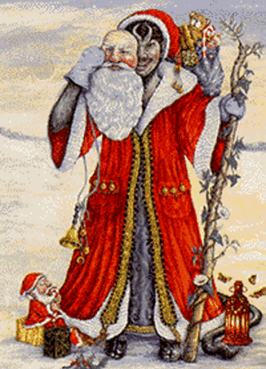 Santa researcher, Phyllis Siefker, echoes Renterghem’s conclusion: It seems obvious, therefore, that Santa Claus can be neither the alter ego of Saint Nicholas nor the brainchild of Washington Irving. . . If we peek behind the imposing Saint Nicholas, we see, glowering in the shadows, the saint’s reprobate companion, Black Pete. He, like Santa, has a coat of hair, a disheveled beard, a bag, and ashes on his face. . . In fact, it is this creature, rather than Irving’s creation or an Asian saint, who fathered Santa Claus. (Siefker, Phyllis. Santa Claus, Last of the Wild Men: The Origins and Evolution of Saint Nicholas. Jefferson: McFarland & Company, Inc., 1997, p. 15) By the way, St. Nicholas did not come down the chimney. It was his fur-clad, dark companion that came down the chimney. One of the reasons his sidekick was called the "Dark One" or "Black Peter" was because he was normally covered in soot and ashes from his chimney travels. The "dark companion" also carried the bag, distributed the goodies and punished the bad boys and girls. Children [in Holland] are told that Black Peter enters the house through the chimney, which also explained his black face and hands, and would leave a bundle of sticks or a small bag with salt in the shoe instead of candy when the child had been bad. ("Saint Nicholas," Wikipedia Encyclopedia. <en.wikipedia.org/wiki/Saint_Nicholas>) It is significant that Black Peter, Pelze-Nicol, Knecht Rupprecht and all of St. Nicholas companions are openly identified as the devil. To the medieval Dutch, Black Peter was another name for the devil. Somewhere along the way, he was subdued by St. Nicholas and forced to be his servant. (Del Re, Gerard and Patricia. The Christmas Almanack. New York: Random House, 2004, p. 44) In Denmark, Sweden, and Norway creatures resembling both the Schimmelreiter and the Klapperbock are or were to be met with at Christmas. . . People seem to have had a bad conscience about these things, for there are stories connecting them with the Devil. A girl, for instance, who danced at midnight with a straw Julebuk, found that her partner was no puppet but the Evil One himself. (Miles, Clement A. Christmas in Ritual and Tradition Christian and Pagan. New York: Frederick A. Stokes Company, 1912, p. 202) Thus, in parts of Europe, the Church turned Herne into Saint Nicholas’ captive, chained Dark Helper, none other than Satan, the Dark One, symbolic of all evil. (Renterghem, Tony van. When Santa Was a Shaman. St. Paul: Llewellyn Publications, 1995, p. 97) One of the bizarre jobs of St. Nick’s devilish helper was to "gleefully drag sinners" to hell! On the eve of December 6, the myth told that this bearded, white-haired old ‘saint,’ clad in a wide mantel, rode through the skies on a white horse, together with his slave, the swarthy Dark Helper. This reluctant helper had to disperse gifts to good people, but much preferred to threaten them with his broom-like scourge, and, at a sign of his master, would gleefully drag sinners away to a place of eternal suffering. (Renterghem, Tony van. When Santa Was a Shaman. St. Paul: Llewellyn Publications, 1995, p. 111) It is also alarming that Santa’s popular title, "Nick," is also a common name for "the devil." Old Nick: A well-known British name of the Devil. It seems probable that this name is derived from the Dutch Nikken, the devil..." (Shepard, Leslie A. Encyclopedia of Occultism and Parapsychology. New York: Gale Research Inc. 1991, p. 650) Nick, the devil. (Skeat, Walter W. Concise Dictionary of English Etymology. Ware: Wordsworth Editions Ltd, 1993, p. 304) Devil: Besides the name Satan, he is also called Beelzebub, Lucifer . . . and in popular or rustic speech by many familiar terms as Old Nick . . . (Oxford English Dictionary) Nicholas is one of the most common devil’s names in German, a name that remains today when Satan is referred as Old Nick. (Siefker, Phyllis. Santa Claus, Last of the Wild Men: The Origins and Evolution of Saint Nicholas. Jefferson: McFarland & Company, Inc., 1997, p. 69) The shocking truth is Santa Claus originated from a character identified as the devil or Satan. Something else that fashioned our modern day Santa was the popular medieval Christmas plays of the tenth through the sixteenth century. These miracle, moral, mystery and passion dramas acted out scenes from the scriptures and the liturgy of the Roman Catholic Church. Combining humor and religion, they flourished during the fifteenth century. It is significant that St. Nicholas was a dominant theme among these plays. Much of the myth and outlandish miracles of St. Nicholas originated from these dramas. And much of the bizarre characteristics of Santa were planted in these Christmas plays. In the classic, Teutonic Mythology, author Jacob Grimm provides us with some revealing detail into St, Nicholas’s transformation into Santa. Notice in the following excerpt from Teutonic Mythology where Nicholas converts himself into the Knecht Ruprecht [the devil], a "man of Clobes" or a "man of Claus." Grimm states, the characters of Nicholas and Knecht Ruprecht "get mixed, and Clobes [Claus] himself is the "man." The Christmas plays sometimes present the Saviour with His usual attendant Peter or else with Niclas [St. Nicholas]. At other times however Mary with Gabriel, or with her aged Joseph, who, disguised as a peasant, acts the part of Knecht Ruprecht Nicholas again has converted himself into a "man Clobes" or Rupert; as a rule there is still a Niclas, a saintly bishop and benevolent being distinct from the "man" who scares children; the characters get mixed, and Clobes himself acts the "man." (qtd. in Siefker, Phyllis. Santa Claus, Last of the Wild Men: The Origins and Evolution of Saint Nicholas. Jefferson: McFarland & Company, Inc., 1997, p. 69) From Grimm’s account, in the early 1100’s, the transformation of St. Nicholas into Santa Claus from the devil Knecht Ruprecht was in full throttle. There is not 
