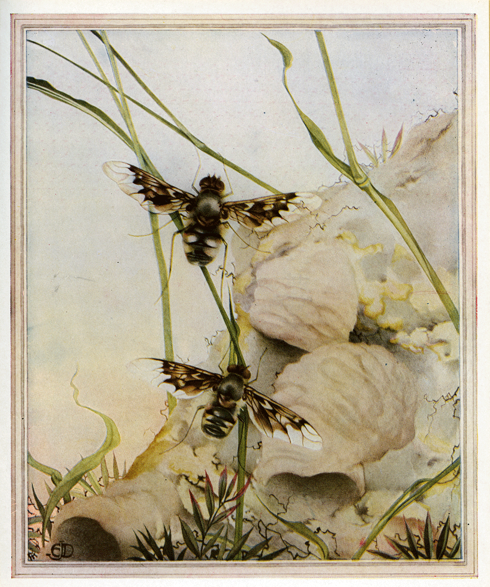 CHAPTER 16: THE ANTHRAX FLY I: A STRANGE MEAL I MADE the acquaintance of the Anthrax in 1855 at Carpentras, when I was searching the slopes of which I have already told you, the slopes beloved of the Anthophora-bees. Her curious pupa, so powerfully equipped to force an outlet for the perfect insect, which is incapable of the least effort, seemed worthy of investigation. For that pupa is armed with a plough- share in front, a trident at its tail, and rows of harpoons on its back, with which to rip open the Osmia-bee's cocoon and break through the hard crust of the hillside. Let us, some day in July, knock away the pebbles that fasten the nests of the Mason-bees to the sloping ground on which they are built. Loosened by the shock, the dome comes off cleanly, all in one piece. Moreover — and this is a great advantage — the cells are all exposed at the base of the nest, for at this point they have no other wall than the surface of the pebble. Without any scraping, which would be wearisome work for us and dangerous to the Bees, we have all the cells before our eyes, together with their contents — a silky, amber-yellow cocoon, as delicate and transparent as the skin of an onion. Let us split the dainty wrappers with the scissors, cell by cell, one after another. If fortune be at all kind, as it always is to the persevering, we shall end by finding cocoons harbouring two larvae together, one more or less faded in appearance, the other fresh and plump. We shall also find some, no less plentiful, in which the withered larva is accompanied by a family of little grubs wriggling un- easily round it. It is easy to see that a tragedy is happening under the cover of the cocoon. The flabby, faded larva is the Mason-bee's. A month ago, in June, having finished its ration of honey, it wove itself a silken sheath in which to take the long sleep that precedes its transformation. It was bulging with fat, and was a rich and a defenceless morsel for any enemy that could reach it. And enemies did reach it. In spite of obstacles that might well seem insurmountable, the wall of mortar and dome-shaped cover, the enemy grubs appeared in the secret retreat, and began to eat the sleeper. Three different species take part in this murderous work, often in the same nest, in adjoining cells. We will concern ourselves only with the Anthrax Fly. The grub, when it has eaten its victim and is left alone in the Mason-bee's cocoon, is a naked worm, smooth, leg- less, and blind. It is creamy-white, and each of its segments or divisions forms a perfect ring, very much curved when at rest, but almost straight when disturbed. Including the head I can count thirteen segments, well-marked in the middle of the body, but in the fore-part difficult to distinguish. The white, soft head shows no sign of any mouth, and is no bigger than a tiny pin's head. The grub has four pale red stigmata, or openings through which to breathe, two in front and two behind, as is the rule among Flies. It has no walking-apparatus whatever; it is absolutely incapable of shifting its position. If I disturb its rest, it curves and straightens itself alternately, tossing about violently where it lies; but it does not manage to progress. But the most interesting point about the grub of the Anthrax is its manner of eating. A most unexpected fact attracts our attention: the curious ease with which this larva leaves and returns to the Bee-grub on which it is feeding. After watching flesh-eating grubs at hundreds and hundreds of meals, I suddenly find myself confronted with a manner of eating that is entirely unlike anything I ever saw before. This, for instance, is the Amophila-grub's way of devouring its caterpillar. A hole is made in the victim's side, and the head and neck of the grub dives deep into the wound. It never withdraws its head, never pauses to take breath. The voracious animal always goes for-ward, chewing, swallowing, digesting, until the caterpillar's skin is empty. Once the meal is begun, the creature does not budge as long as the food lasts. If moved by force it hesitates, and hunts about for the exact spot where it left off eating; for if the caterpillar be attacked at a fresh point it is liable to go bad. In the case of the Anthrax-grub there is none of this mangling, none of this persistent clinging to the original wound. If I tease it with the tip of a pointed brush it at once retires, and there is no wound to be seen on the victim, no sign of broken skin. Soon the grub once more applies its pimple-head to its meal, at any point, no matter where, and keeps itself fixed there without any effort. If I repeat the touch with the brush I see the same sudden retreat and the same calm return to the meal. The ease with which this larva grips, leaves, and re-grips its victim, now here, now there, and always without a wound, shows that the mouth of the Anthrax is not armed with fangs that can dig into the skin and tear it. If the flesh were gashed by pincers of any kind, one or two attempts would be necessary before they could leave go or take hold again; and besides, the skin would be broken. There is nothing of the kind: the grub simply glues its mouth to its prey, and withdraws it. It does not chew its food like the other flesh-eating grub: it does not eat, it inhales. This remarkable fact led me to examine the mouth under the microscope. It is a small conical crater, with yellowish-red sides and very faint lines running round it. At the bottom of this funnel is the opening of the throat. There is not the slightest trace of mandibles or jaws, or any object capable of seizing and grinding food. There is nothing at all but the bowl-shaped opening. I know of no other example of a mouth like this, which I can only compare to a cupping-glass. Its attack is a mere kiss, but what a cruel kiss! To observe the working of this curious machine I placed a new-born Anthrax-grub, together with its prey, in a glass tube. Here I was able to watch the strange