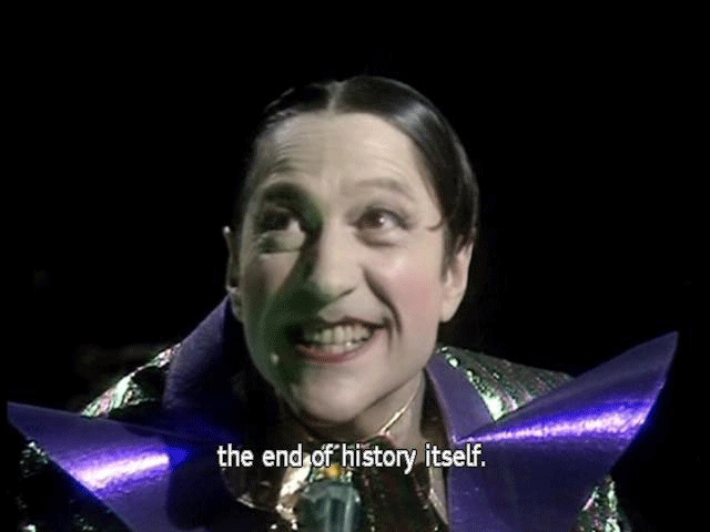 [Max] Good evening, ladies and gentlemen! (APPLAUSE AND CHEERS) Ladies and gentlemen, the Universe as we know it has been in existence for 170,000 million billion years, and will be ending in a little over ten minutes' time. So, welcome one and all to Milliways, the Restaurant at the End of the Universe! I am your host this evening, Max Quordlepleen, and I have come straight from the very, very other End of Time, where I've been hosting a show at the Big Bang Burger Bar, where we had a very exciting evening, ladies and gentlemen, and I will be with you right through this tremendous historic occasion -- the end of history itself. So now, ladies and gentlemen, take your places at the table. The candles are lit, the band is playing, and as the force-shielded dome above us slides apart revealing a dark and sullen sky hung with the ancient light of livid, swollen stars, I can see we are in for a fabulous evening's apocalypse! Thank you, ladies and gentlemen, I'll be back again in a moment. --The Hitchhiker's Guide to the Galaxy, directed by Douglas Adams |
