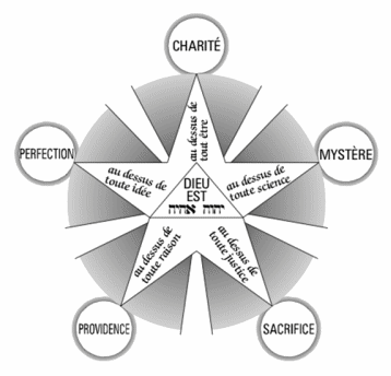 {Illustration on page 286 described: This is a pentagram with an upright isosceles triangle in the midst, lower angles touching the two lower inner angles of the pentagram. There are white disks touching the points from the outside. The pentagram is white and circumscribed by a nimbus having five white wedge-rays coming from the inner angles and opening at the outer edge of the nimbus. The white disks have each a thin nimbus without rays and the following words, clockwise from top: “CHARITE”, ”MYSTERE”, ”SACRIFICE”, ”PROVIDENCE”, ”PERFECTION”. The points have the following text inside, set in script type, same order: ”au dessus de tout etre”, ”au dessus de toute science”, ”au dessus de toute justice”, ”au dessus de toute raison”, ”au dessus de toute idee”. In the central triangle are three lines with the words: ”DIEU EST Yod-Heh-Vau-Heh Aleph-Heh-Yod-Heh.}