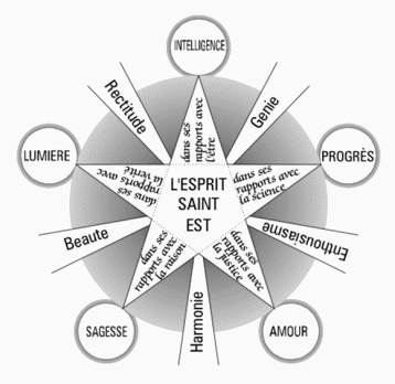 {Illustration on page 287 described: This is in shape exactly the same as the illustration on page 282, save that there are words in the five wedge rays and there is no triangle in the center. Instead, the sides of the pentagram are extended as dotted lines to form an inverse pentagon. The white disks have the following text, clockwise from top: “INTELLIGENCE”, “PROGRES”, “AMOUR”, “SAGESSE”, “LUMIERE”. The points have the following text, same order: “dans ses rapports avec l’ etre”, “dans ses rapports avec la science”, “dans ses rapports avec la justice”, “dans ses rapports avec la raison”, “dans ses rapports avec la verite”. The rays have the following text, clockwise from upper right: “Genie”, “Enthousiasme”, “Harmonie”, “Beaute”, “Rectitude”. The following words are in the center, in three rows: “L’ESPRIT SAINT EST”.}