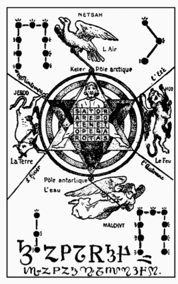 {Illustration on page 288 described: This is bounded by a rectangle with height about twice width. The center of the illustration is composed of a hexagram of two triangles, points to top and bottom. This is circumscribed by a dark ring and surmounts concentric rings inward from the outer one as white, dark, white, dark — at which point the inner angles of the hexagram begin. The upper triangle of the hexagram is light and contains a bearded human head and shoulders at top, feet with draped legs to the lower points. The down-ward pointing triangle has the same in dark with a matching dark figure. Surmounting the center of the hexagram and completely obscuring bodies and arms is the classic Roman Agricultural magical square of five lines: SATOR, AREPO, TENET, OPERA, ROTAS. The outer points of the hexagram extend lines radially to irregularly divide the space to the rectangular border, upper and lower points excepted. Above the upper point are the words “Keter Pole arctique” and there is a nob at that spot with a line pulled diagonally upward to the left by an eagle, facing counter clockwise. Above the eagle is the word “NETSAH”, to the right “L Air”. The line from the upper right point has “l’ Ete” above it and the figure of a winged lion below, facing outward and progressing upward. The lion has “HOD” written to the right of its head and vertically extended left foreleg, “Le Feu” below its tail and downwardly extended right hind leg. The line from the lower right point is below this figure, and “l’ Automne” is below this line. The line from the upper left point has “les Printemps” written above it. Below this is a bull, no wings and facing downward. ”JESOD” is above the bull’s tail, and ”La Terre” is below the head. Next below is the line from the lower left point, with “l’ hiver” below that. Below the lower point are the words “Pole antartique” and “L’ eau”. There is a nob at that spot, with a winged angel facing right and pulling the nob with a diagonally downward line to the right. “MALCHVT” is written below the Angel. The letters “HB:Yod” “HB:Heh ” “HB:Vau ” “HB:Heh ” are picked out by dots with three clustered radial dashes in or near the four corners, starting with the upper right (clockwise or counter-clockwise makes no difference). These dot-letters are the late Medieval style, and either represent stars or fires. The Hebrew letters are formed by straight line segments connecting the dots. The Hay’s have three dots to the upper bar: ends and center with the dashes to the top. The verticals on the Hays have three dots and join the upper bar to add a fourth, with the three having their dashes facing outward. The Yod is composed of two lines, dots at ends and intersection. Dashes at top vertical, center dot dashes to the right and lower dot dashes to left. The Vau has three dots, ends and center with dashes in same directions as the Vau. The figure is completed by two lines of flourished symbols at the bottom: Larger upper line looks like: 3 or h (bottom end of corner Vau) Z P 7 R 3(or h) 4 (reversed), but is intended to represent the seven planets starting with Saturn and ending with Jupiter.. The smaller lower line looks like: M Z P Z 3(or h) N 7 M N 3(or h) F (reversed) N, but is intended to represent the twelve signs of the Zodiac. These symbols are somewhat doubtful in identity, owing to the obscuration of using letter and number shapes to conceal the standard Astrological symbols and to the jumbled sequence.}