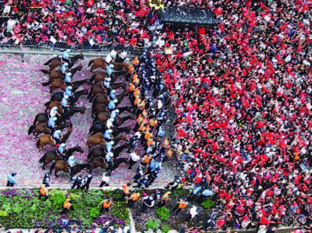Boston Superintendent-in-Chief Daniel Linskey Given that history with major sporting events, it was interesting to have the Red Sox go to the World Series, the Patriots go to the Super Bowl, and the Celtics win the NBA Finals as soon as I took this job. I’m still here, so I guess I did OK. We have gotten much better at crowd control. Our planning staff went to the cops on the street and asked what they needed. That’s how we developed our plan. We are still refining and improving. Just like in Los Angeles, the fans coming out of the TD Garden arena aren’t a problem. However, all the downtown entertainment centers are packed with people, and suddenly there are tens of thousands of people who want to stand in the streets and celebrate. They want to be near the event. We’ve urged bars to close up their windows. We also clear the streets at halftime to prevent loitering outside. It’s crucial to have police officers who can talk to the crowd and don’t get nervous. I had a sergeant with only 12 officers clear a Red Sox celebration of 15,000 drunk, hollering college kids, simply by having conversations with them and encouraging them to go home. If you treat people with respect, they can be the eyes and ears for police in case people start throwing bottles and rocks. The crowd begins to police itself. And that sergeant did more than a public order platoon could in terms of moving that crowd. Once the turtle gear comes out, it puts the crowd in the mindset that there’s going to be a fight, and then everyone gathers around to either participate or watch the fight. One of the signs that a crowd is getting out of hand is the presence of fire. As soon as they start lighting things on fire, you have to get a handle on it quickly, because it’s almost like it triggers a primeval instinct. People just start going wild and it builds. We learned an important lesson about combating fires from the first Patriots Super Bowl in 2002. Someone pulled a fire alarm, but the streets were filled with 20,000 people. The fire department pulled up in a truck and I told them, “You can’t go down there, and if you do, I won’t be able to get you out.” And they said, “No, we have to go; this is what we do.” Needless to say, after the truck pulled into the crowd, I got a call saying that the crowd was trying to flip the truck over. And it turned out that there was no fire; it was a false fire alarm. So now we have embedded fire units. Often you don’t need a big truck to come in. A chief with a fire extinguisher can put a small fire out, and that calms down the crowd. After that, you can talk to people about moving along and grab the guy who started the fire.
