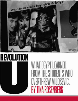 The Egyptian example shows how. The April 6 movement knew about Otpor and adopted the fist as its logo even before Mohamed Adel went to Belgrade. The course he took there was the same one the Burmese took. Last April, Serbian newspapers carried a front page photo of a protest in Egypt, with demonstrators waving the April 6 flag, complete with a familiar fist logo. "The Otpor fist threatening Mubarak?" the headline read. As images of demonstrators in Tahrir Square hoisting their children onto Egyptian Army tanks filtered out to the rest of the world last week, Popovic recalled that on Adel's power graph, the military loomed particularly large; it was crucial, he had realized, to pull out that pillar.