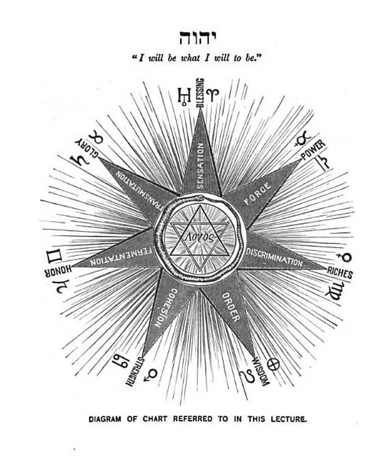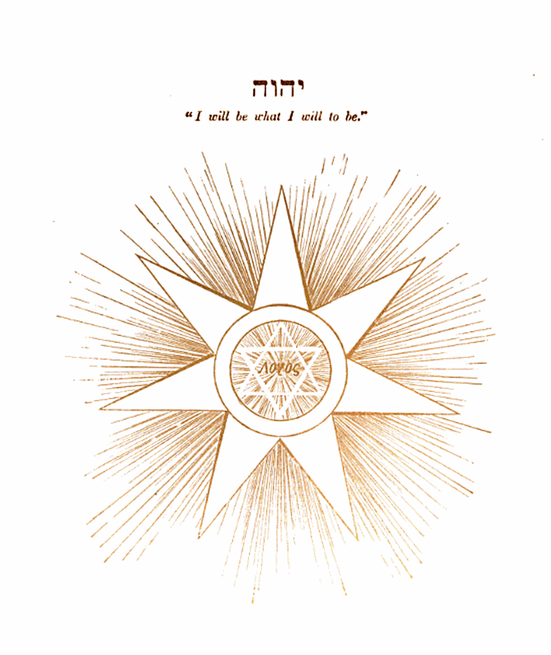 We know that we cannot move a muscle without the consent of the will. We talk about the involuntary action of the system, but such action is nothing more or less than the movement by the will in accordance with an established habit of being. Every possible action of our organization may, by the effort of our own will, be suspended; and investigation has proved that there are those who are capable of suspending every action or function of the system, even bringing the involuntary activities under control of the will. Thus habit, being induced through the operation either of one's own will or of that of the parent organism, may again be dominated by the same agency. Continued practice causes the hand of the mechanic or musician to act in as regular and systematic manner as do any of the apparently involuntary muscles. I have seen men execute the most intricate mechanical work, that which required the utmost nicety and exercise of fine artistic sense, such as could be attained only by long and untiring application, without any apparent thought or attention. Therefore, we see that the will not only establishes but corrects and controls habits, and is the dominant power and ruler of all. In our search after God it becomes necessary to look within and beyond. We therefore proceed in accordance with this law in our analysis of the highest form of earthly organization; namely, man. When we have ascertained what man actually is, we begin to form a rational, in fact the highest possible, conception of how and from whence he originated. Let us turn our attention to the old cabalistic name Yahveh, which I have chosen to place on this chart (see diagram) as representing the cause of the seven creative principles, which we shall discuss in subsequent lectures. This (pointing to the chart) is the Hebrew word Yahveh. It occurs over sixty-four hundred times in the Hebrew Bible. It is translated, I think, in our version but four times, in three of which it is rendered as Jehovah, and in the fourth as Jah or Yah; and you will notice in the English translation of the Scriptures, that wherever the name of the Deity is used, when derived from Yahveh, it is invariably spelled with capital letters. This word Yahveh, the cabalistic name for GOD, means, "I will be what I will to be." You will see that this expresses supreme ability and indomitable potency. Who among the sons of men dare step forward and say, "I will be what I will to be"? Think of it! not merely implying, but asserting, that the ability to be whatever he wills to be exists in himself. Here we have a foundation thought, and here I will say, that in this "I will be what I will to be" we find the key to the whole Hebraic Scripture. Now let us look and see what a subtle power the will is. We will, and we move; or the will may be excited, and we say that we are angry; and when the will is excited to anger, what a storm exists in the body! how the red blood mounts to the face! every nerve is strained to its utmost tension! what an abnormal strength is called into being to resist and overcome obstacles! And thus even the weakest organizations are by this power of the aroused will enabled to assert and maintain their right (or possibly wrong) at all hazard. Thus you see that the will is the absolute monarch, ruling every muscle and nerve, governing every thought; and that every other power in man is subservient to this king, THE WILL. Let us look still further, and turn our attention to this planet, earth. It is relatively but a little ball revolving around the sun, its great centre of light. It has eight companions, — yes, more; there is a large family of worlds, each revolving around the same centre, each following in its own prescribed orbit. Here we must become conscious that there is a great power that causes these worlds to revolve around their common centre, each travelling in its defined orbit; and then we find that our centre, the sun, is but a planet of a greater and grander system, and is, with its family of worlds, revolving around another sun; and further still, that this third sun and its family of worlds, is travelling around another sun of a still greater and grander system, so great and grand that it is supposed by some that to complete one revolution consumes over twenty-two and a half million of our years. Here the telescopic deductions of man now cease. But do mathematics cease here? We think not. There are mathematical methods by which it can be proven that all these worlds are born from a great central sun; and that as they are farther and farther removed from it, they become finer and more ethereal, are more fully developed by the same law of transmutation and change that we observe in our planet, the earth; which earth is but an immense electric machine, generating currents of electricity and magnetism which bind it to its sun. The material elements are being transmuted to finer essences of being, and in these worlds born from the central sun we find that they are getting finer and less physically strong in their currents; therefore they are drifting farther away from their centre. If we will investigate our planet, the earth, we shall find that it is becoming finer and less strong physically; that every generation of its inhabitants is becoming more refined than its predecessor. Look back for a few generations, and see what a different character they bore from the people of today; how much weaker are we in muscle, how much stronger in brain; how much greater flights of thought are being taken today than in years long ago. Thus thought and mental power are gaining, while physical energy is decreasing. Thought is the co-worker of the will; it is not the will, but is submissive to its power: we think, and consequently act. But there are powers that can overcome the mandates of our will: for instance, let us take electricity. Suppose you take hold of the poles of a strong electric battery, put your will to work and say you will hol