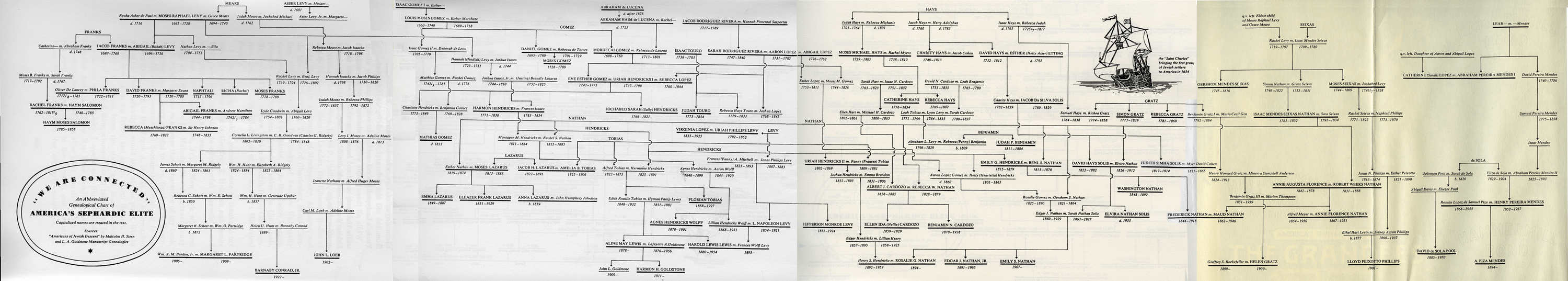 Mr. Julian Nathan, elegant young New Yorker, in Central Park with cart and groom. Museum of the City of New York Cousin Florian Tobias, who enjoyed leisure, worked at nothing; with George, his chauffeur, and "the first automobile in Saratoga," circa 1900. Courtesy of Mrs. Lafayette A. Goldstone. Barnard College founder Annie Nathan Meyer, as a girl of about fifteen. Barnard College Archives Annie Nathan Meyer in later years. Barnard College Archives Maude Nathan Nathan (she married a cousin), and her husband, bound for a costume ball In 1970, three direct descendants of the Twenty-Three placed a commemorative wreath on the plaque erected in downtown Manhattan to mark the spot where the first Jews entered the New World. From left, the children are Sara Ellen Nathan, daughter of Mr. and Mrs. Edgar J. Nathan III, Henry Hendricks Schulson, son of Mr. and Mrs. Hyman A. Schulson; and Jean Elson Nathan, daughter of Mr. and Mrs. Frederic Da Silva Solis Nathan. B & G International Photos "WE ARE CONNECTED". An Abbreviated Genealogical Chart of AMERICA'S SEPHARDIC ELITE. Capitalized names are treated in the text. Sources: "Americans of Jewish Descent" by Malcolm H. Stern and L.A. Goldstone Manuscript Genealogies The "Saint Charles" bringing the first group of Jewish settlers to America in 1654