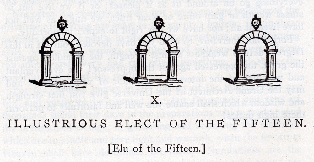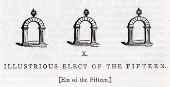 X. ILLUSTRIOUS ELECT OF THE FIFTEEN. [Elu of the Fifteen ] THIS Degree is devoted to the same objects as those of the Elu of Nine; and also to the cause of Toleration and Liberality against Fanaticism and Persecution, political and religious; and to that of Education, Instruction, and Enlightenment against Error, Barbarism, and Ignorance. To these objects you have irrevocably and forever devoted your hand, your heart, and your intellect; and whenever in your presence a Chapter of this Degree is opened, you will be most solemnly reminded of your vows here taken at the altar. Toleration, holding that every other man has the same right to his opinion and faith that we have to ours; and liberality, holding that as no human being can with certainty say, in the clash and conflict of hostile faiths and creeds, what is truth, or that he is surely in possession of it, so every one should feel that it is quite possible that another equally honest and sincere with himself, and yet holding the contrary opinion, may himself be in possession of the truth, and that whatever one firmly and conscientiously believes, is truth, to him--these are the mortal enemies of that fanaticism which persecutes for opinion's sake, and initiates crusades against whatever it, in its imaginary holiness, deems to be contrary to the law of God or verity of dogma. And education, instruction, and enlightenment are the most certain means by which fanaticism and intolerance can be rendered powerless. No true Mason scoffs at honest convictions and an ardent zeal in the cause of what one believes to be truth and justice. But he does absolutely deny the right of any man to assume the prerogative of Deity, and condemn another's faith and opinions as deserving to be punished because heretical. Nor does he approve the course of those who endanger the peace and quiet of great nations, and the best interest of their own race by indulging in a chimerical and visionary philanthropy--a luxury which chiefly consists in drawing their robes around them to avoid contact with their fellows, and proclaiming themselves holier than they. For he knows that such follies are often more calamitous than the ambition of kings; and that intolerance and bigotry have been infinitely greater curses to mankind than ignorance and error. Better any error than persecution! Better any opinion than the thumb-screw, the rack, and the stake! And he knows also how unspeakably absurd it is, for a creature to whom himself and everything around him are mysteries, to torture and slay others, because they cannot think as he does in regard to the profoundest of those mysteries, to understand which is utterly beyond the comprehension of either the persecutor or the persecuted. Masonry is not a religion. He who makes of it a religious belief, falsifies and denaturalizes it. The Brahmin, the Jew, the Mahometan, the Catholic, the Protestant, each professing his peculiar religion, sanctioned by the laws, by time, and by climate, must needs retain it, and cannot have two religions; for the social and sacred laws adapted to the usages, manners, and prejudices of particular countries, are the work of men. But Masonry teaches, and has preserved in their purity, the cardinal tenets of the old primitive faith, which underlie and are the foundation of all religions. All that ever existed have had a basis of truth; and all have overlaid that truth with errors. The primitive truths taught by the Redeemer were sooner corrupted, and intermingled and alloyed with fictions than when taught to the first of our race. Masonry is the universal morality which is suitable to the inhabitants of every clime, to the man of every creed. It has taught no doctrines, except those truths that tend directly to the well-being of man; and those who have attempted to direct it toward useless vengeance, political ends, and Jesuitism, have merely perverted it to purposes foreign to its pure spirit and real nature. Mankind outgrows the sacrifices and the mythologies of the childhood of the world. Yet it is easy for human indolence to linger near these helps, and refuse to pass further on. So the unadventurous Nomad in the Tartarian wild keeps his flock in the same close-cropped circle where they first learned to browse, while the progressive man roves ever forth "to fresh fields and pastures new." The latter is the true Mason; and the best and indeed the only good Mason is he who with the power of business does the work of life; the upright mechanic, merchant, or farmer, the man with the power of thought, of justice, or of love, he whose whole life is one great act of performance of Masonic duty. The natural use of the strength of a strong man or the wisdom of a wise one, is to do the work of a strong man or a wise one. The natural work of Masonry is practical life; the use of all the faculties in their proper spheres, and for their natural function. Love of Truth, justice, and generosity as attributes of God, must appear in a life marked by these qualities; that is the only effectual ordinance of Masonry. A profession of one's convictions, joining the Order, assuming the obligations, assisting at the ceremonies, are of the same value in science as in Masonry; the natural form of Masonry is goodness, morality, living a true, just, affectionate, self-faithful life, from the motive of a good man. It is loyal obedience to God's law. The good Mason does the good thing which comes in his way, and because it comes in his way; from a love of duty, and not merely because a law, enacted by man or God, commands his will to do it. He is true to his mind, his conscience, heart, and soul, and feels small temptation to do to others what he would not wish to receive from them. He will deny himself for the sake of his brother near at hand. His desire attracts in the line of his duty, both being in conjunction. Not in vain does the poor or the op-pressed look up to him. You find such men in all Christian sects, Protestant an