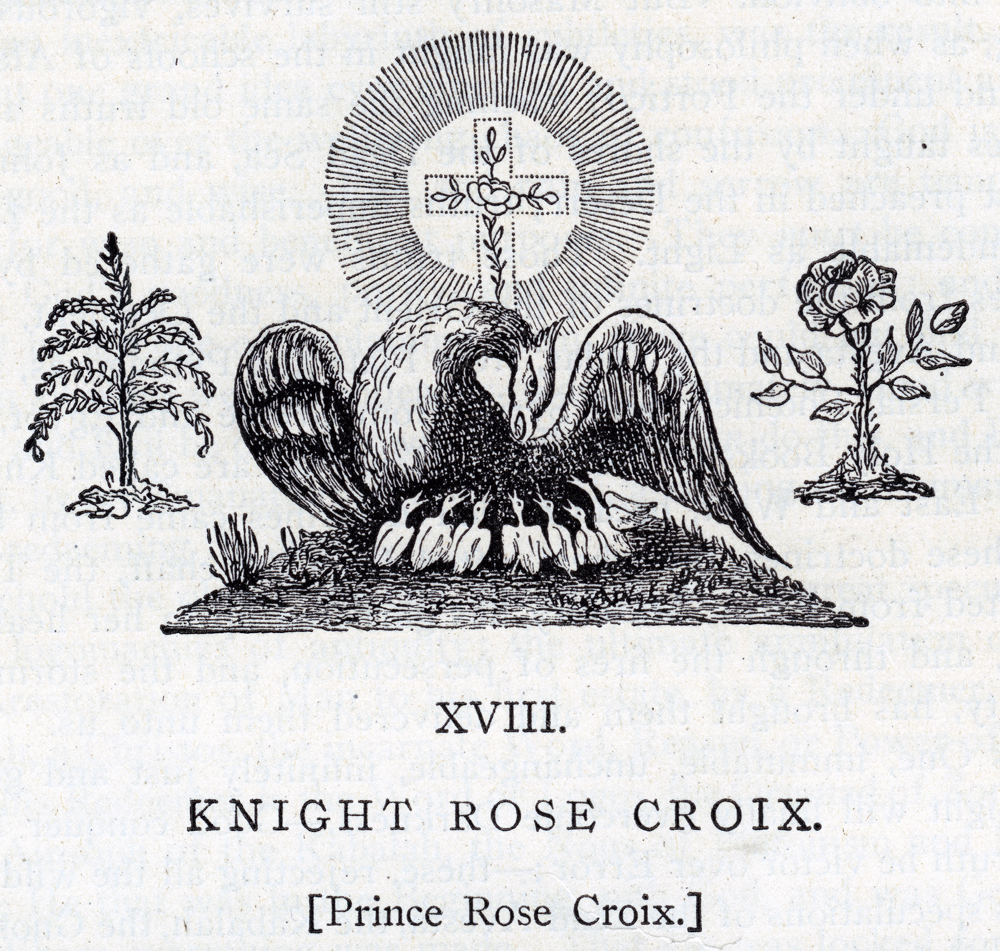 When this Degree had its origin, it is not important to inquire; nor with what different rites it has been practised in different countries and at various times. It is of very high antiquity. Its ceremonies differ with the degrees of latitude and longitude, and it receives variant interpretations. If we were to examine all the different ceremonials, their emblems, and their formulas, we should see that all that belongs to the primitive and essential elements of the order, is respected in every sanctuary. All alike practise virtue, that it may produce fruit. All labor, like us, for the extirpation of vice, the purification of man, the development of the arts and sciences, and the relief of humanity. None admit an adept to their lofty philosophical knowledge, and mysterious sciences, until he has been purified at the altar of the symbolic Degrees. Of what importance are differences of opinion as to the age and genealogy of the Degree, or variance in the practice, ceremonial and liturgy, or the shade of color of the banner under which each tribe of Israel marched, if all revere the Holy Arch of the symbolic Degrees, first and unalterable source of Free-Masonry; if all revere our conservative principles, and are with us in the great purposes of our organization? If, anywhere, brethren of a particular religious belief have been excluded from this Degree, it merely shows how gravely the purposes and plan of Masonry may be misunderstood. For whenever the door of any Degree is closed against him who believes in one God and the soul's immortality, on account of the other tenets of his faith, that Degree is Masonry no longer. No Mason has the right to interpret the symbols of this Degree for another, or to refuse him its mysteries, if he will not take them with the explanation and commentary superadded. Listen, my brother, to our explanation of the symbols of the Degree, and then give them such further interpretation as you think fit. The Cross has been a sacred symbol from the earliest Antiquity. It is found upon all the enduring monuments of the world, in Egypt, in Assyria, in Hindostan, in Persia, and on the Buddhist towers of Ireland. Buddha was said to have died upon it. The Druids cut an oak into its shape and held it sacred, and built their temples in that form. Pointing to the four quarters of the world, it was the symbol of universal nature. It was on a cruciform tree, that Chrishna was said to have expired, pierced with arrows. It was revered in Mexico. But its peculiar meaning in this Degree, is that given to it by the Ancient Egyptians. Thoth or Phtha is represented on the oldest monuments carrying in his hand the Crux Ansata, or Ankh, [a Tau cross, with a ring or circle over it]. He is so seen on the double tablet of Shufu and Noh Shufu, builders of the greatest of the Pyramids, at Wady Meghara, in the peninsula of Sinai. It was the hieroglyphic for life, and with a triangle prefixed meant life-giving. To us therefore it is the symbol of Life -- of that life that emanated from the Deity, and of that Eternal Life for which we all hope; through our faith in God's infinite goodness. The ROSE, was anciently sacred to Aurora and the Sun. It is a symbol of Dawn, of the resurrection of Light and the renewal of life, and therefore of the dawn of the first day, and more particularly of the resurrection: and the Cross and Rose together are therefore hieroglyphically to be read, the Dawn of Eternal Life which all Nations have hoped for by the advent of a Redeemer. The Pelican feeding her young is an emblem of the large and bountiful beneficence of Nature, of the Redeemer of fallen man, and of that humanity and charity that ought to distinguish a Knight of this Degree. The Eagle was the living Symbol of the Egyptian God Mendes or Menthra, whom Sesostris-Ramses made one with Amun-Re, the God of Thebes and Upper Egypt, and the representative of the Sun, the word RE meaning Sun or King. The Compass surmounted with a crown signifies that notwithstanding the high rank attained in Masonry by a Knight of the Rose Croix, equity and impartiality are invariably to govern his conduct. To the word INRI, inscribed on the Crux Ansata over the Master's Seat, many meanings have been assigned. The Christian Initiate reverentially sees in it the initials of the inscription upon the cross on which Christ suffered -- Jesus Nazarenus Rex Iudæorum. The sages of Antiquity connected it with one of the greatest secrets of Nature, that of universal regeneration. They interpreted it thus, Igne Natura renovator integra; [entire nature is renovated by fire]: The Alchemical or Hermetic Masons framed for it this aphorism, Igne nitrum roris invenitur. And the Jesuits are charged with having applied to it this odious axiom, Justum necare reges impios. The four letters are the initials of the Hebrew words that represent the four elements -- Iammim, the seas or water; Nour, fire; Rouach, the air, and Iebeschah, the dry earth. How we read it, I need not repeat to you. The CROSS