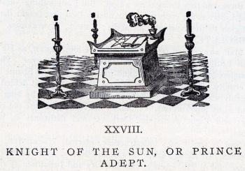 XXVIII. KNIGHT OF THE SUN OR PRINCE ADEPT. GOD is the author of everything that existeth; the Eternal, the Supreme, the Living, and Awful Being; from Whom nothing in the Universe is hidden. Make of Him no idols and visible images; but rather worship Him in the deep solitudes of sequestered forests; for He is invisible, and fills the Universe as its soul, and liveth not in any Temple! Light and Darkness are the World's Eternal ways. God is the principle of everything that exists, and the Father of all Beings. He is eternal, immovable, and Self-Existent. There are no bounds to His power. At one glance He sees the Past, the Present, and the Future; and the procession of the builders of the Pyramids, with us and our remotest Descendants, is now passing before Him. He reads our thoughts before they are known to ourselves. He rules the movements of the Universe, and all events and revolutions are the creatures of His will. For He is the Infinite Mind and Supreme Intelligence. In the beginning Man had the WORD, and that WORD was from God: and out of the living power which, in and by that WORD, was communicated to man, came the LIGHT of his existence. Let no man speak the WORD, for by it THE FATHER made light and darkness, the world and living creatures! The Chaldean upon his plains worshipped me, and the sea-loving Phnician. They builded me temples and towers, and burned sacrifices to me upon a thousand altars. Light was divine to them, and they thought me a God. But I am nothing--nothing; and LIGHT is the creature of the unseen GOD that taught the true religion to the Ancient Patriarchs: AWFUL, MYSTERIOUS, THE ABSOLUTE. Man was created pure; and God gave him TRUTH, as He gave him LIGHT. He has lost the truth and found error. He has wandered far into darkness; and round him Sin and Shame hover evermore. The Soul that is impure, and sinful, and defiled with earthly stains, cannot again unite with God, until, by long trials and many purifications, it is finally delivered from the old calamity; and Light overcomes Darkness and dethrones it, in the Soul. God is the First; indestructible, eternal, UNCREATED, INDIVISIBLE. Wisdom, Justice, Truth, and Mercy, with Harmony and Love, are of His essence, and Eternity and Infinitude of Extension. He is silent, and consents with MIND, and is known to Souls through MIND alone. In Him were all things originally contained, and from Him all things were evolved. For out of His Divine SILENCE and REST, after an infinitude of time, was unfolded the WORD, or the Divine POWER; and then in turn the Mighty, ever-acting, measureless INTELLECT; and from the WORD were evolved the myriads of suns and systems that make the Universe; and fire, and light, and the electric HARMONY, which is the harmony of spheres and numbers: and from the INTELLECT all Souls and intellects of men. In the Beginning, the Universe was but ONE SOUL. HE was THE ALL, alone with TIME and SPACE, and Infinite as they. ------ HE HAD THIS THOUGHT: "I Create Worlds:" and lo! the Universe, and the laws of harmony and motion that rule it. the expression of a thought of God; and bird and beast, and every living thing but Man: and light and air, and the mysterious cur-rents, and the dominion of mysterious numbers! ------ HE HAD THIS THOUGHT: "I Create Man, whose Soul shall be my image, and he shall rule." And lo! Man, with senses, instinct, and a reasoning mind! ------ And yet not MAN! but an animal that breathed, and saw, and thought: until an immaterial spark from God's own Infinite Being penetrated the brain, and became the Soul: and lo, MAN THE IMMORTAL! Thus, threefold, fruit of God's thought, is Man; that sees and hears and feels; that thinks and reasons; that loves and is in harmony with the Universe. Before the world grew old, the primitive Truth faded out from men's Souls. Then man asked himself, "What am I? and how and whence am I? and whither do I go?" And the Soul, looking inward upon itself, strove to learn whether that "I" were mere matter; its thought and reason and its passions and affections mere results of material combination; or a material Being enveloping an immaterial Spirit: . . and further it strove, by self-examination, to learn whether that Spirit were an individual essence, with a separate immortal existence, or an infinitesimal portion of a Great First Principle, inter-penetrating the Universe and the infinitude of space, and undulating like light and heat: . . and so they wandered further amid the mazes of error; and imagined vain philosophies; wallowing in the sloughs of materialism and sensualism, of beating their wings vainly in the vacuum of abstractions and idealities. While yet the first oaks still put forth their leaves, man lost the perfect knowledge of the One True God, the Ancient Absolute Existence, the Infinite Mind and Supreme Intelligence; and floated helplessly out upon the shoreless ocean of conjecture. Then the soul vexed itself with seeking to learn whether the material Universe was a mere chance combination of atoms, or the work of Infinite, Uncreated Wisdom: . . whether the Deity was a concentrated, and the Universe an extended immateriality; or whether He was a personal existence, an Omnipotent, Eternal, Supreme Essence, regulating matter at will; or subjecting it to unchangeable laws throughout eternity; and to Whom, Himself Infinite and Eternal, Space and Time are unknown. With their finite limited vision they sought to learn the source and explain the existence of Evil, and Pain, and Sorrow; and so they wandered ever deeper into the darkness, and were lost; and there was for them no longer any God; but only a great, dumb, soulless Universe, full of mere emblems and symbols. You have heretofore, in some of the Degrees through which you have passed, heard much of the ancient worship of the Sun, the Moon, and the other bright luminaries of Heaven, and of the Elements and Powers of Universal Nature. You have been made, to some extent, familiar with their person