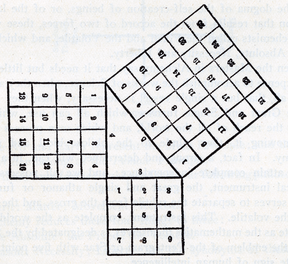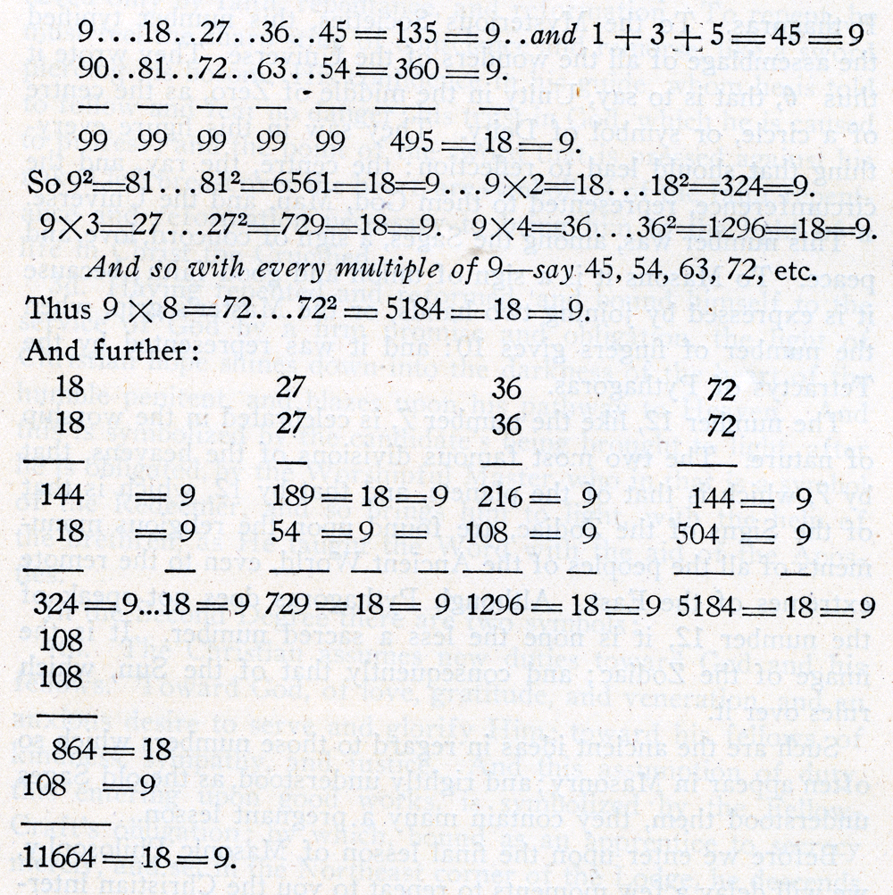 The first line of figures gives the regular series, from 1 to 10. The second reproduces this line doubly; first ascending, from the first figure of 18, and then returning from the second figure of 81. It follows, from the curious fact, that the half of the numbers which compose this progression represents, in inverse order, the figures of the second half: The number 10, or the Denary, is the measure of everything; and reduces multiplied numbers to unity. Containing all the numerical and harmonic relations, and all the properties of the numbers which precede it, it concludes the Abacus or Table of Pythagoras. To the Mysterious Societies, this number typified the assemblage of all the wonders of the Universe. They wrote it thus θ, that is to say, Unity in the middle of Zero, as the centre of a circle, or symbol of Deity. They saw in this figure everything that should lead to reflection: the centre, the ray, and the circumference, represented to them God, Man, and the Universe. This number was, among the Sages, a sign of concord, love, and peace. To Masons it is a sign of union and good faith; because it is expressed by joining two hands, or the Master's grip, when the number of fingers gives 10: and it was represented by the Tetractys of Pythagoras. The number 12, like the number 7, is celebrated in the worship of nature. The two most famous divisions of the heavens, that by 7, which is that of the planets, and that by 12, which is that of the Signs of the Zodiac, are found upon the religious monuments of all the peoples of the Ancient World, even to the remote extremes of the East. Although Pythagoras does not speak of the number 12, it is none the less a sacred number. It is the image of the Zodiac; and consequently that of the Sun, which rules over it. Such are the ancient ideas in regard to those numbers which so often appear in Masonry; and rightly understood, as the old Sages understood them, they contain many a pregnant lesson. Before we enter upon the final lesson of Masonic Philosophy, we will delay a few moments to repeat to you the Christian interpretations of the Blue Degrees. In the First Degree, they said, there are three symbols to be applied. 1st. Man, after the fall, was left naked and defenceless against the just anger of the Deity. Prone to evil, the human race staggered blindly onward into the thick darkness of unbelief, bound fast by the strong cable-tow of the natural and sinful will. Moral corruption was followed by physical misery. Want and destitution invaded the earth. War and Famine and Pestilence filled up the measure of evil, and over the sharp flints of misfortune and wretchedness man toiled with naked and bleeding feet. This condition of blindness, destitution, misery, and bondage, from which to save the world the Redeemer came, is symbolized by the condition of the candidate, when he is brought up for the first time to the door of the Lodge. 2d. Notwithstanding the death of the Redeemer, man can be saved only by faith, repentance, and reformation. To repent, he must feel the sharp sting of conscience and remorse, like a sword piercing his bosom. His confidence in his guide, whom he is told to follow and fear no danger; his trust in God, which he is caused to profess; and the point of the sword that is pressed against his naked left breast over the heart, are symbolical of the faith, repentance and reformation necessary to bring him to the light of a life in Christ the Crucified. 3d. Having repented and reformed, and bound himself to the service of God by a firm promise and obligation, the light of Christian hope shines down into the darkness of the heart of the humble penitent, and blazes upon his pathway to Heaven. And this is symbolized by the candidate's being brought to light, after he is obligated, by the Worshipful Master, who in that is a symbol of the Redeemer, and so brings him to light, with the help of the brethren, as He taught the Word with the aid of the Apostles. In the Second Degree there are two symbols: 4th. The Christian assumes new duties toward God and his fellows. Toward God, of love, gratitude, and veneration, and an anxious desire to serve and glorify Him; toward his fellows, of kindness, sympathy, and justice. And this assumption of duty, this entering upon good works, is symbolized by the Fellow-Craft's obligation; by which, bound as an apprentice to secrecy merely, and set in the Northeast corner of the Lodge, he descends as a Fellow-Craft into the body of the brethren, and assumes the active duties of a good Mason. 5th. The Christian, reconciled to God, sees the world in a new light. This great Universe is no longer a mere machine, wound up and set going six thousand or sixty millions years ago, and left to run on afterward forever, by virtue of a law of mechanics created at the beginning, without further care or consideration on the part of the Deity; but it has now become to him a great emanation from God, the product of His thought, not a mere dead machine, but a thing of life, over which God watches continually, and every movement of which is immediately produced by His present action, the law of harmony being the essence of the Deity, re-enacted every instant. And this is symbolized by the imperfect instruction given in the Fellow-Craft's Degree, in the sciences, and particularly geometry, connected as the latter is with God Himself in the mind of a Mason, because the same letter, suspended in the East, represents both; and astronomy, or the knowledge of the laws of motion and harmony that govern the spheres, is but a portion of the wider science of geometry. It is so symbolized, because it is here, in the Second Degree, that the candidate first receives an other than moral instruction. There are also two symbols in the Third Degree, which, with the 3 in the first, and 2 in the second, make the 7. 6th. The candidate, after passing through the first part of the ceremony, imagines himself a Master; and is surprised to be infor