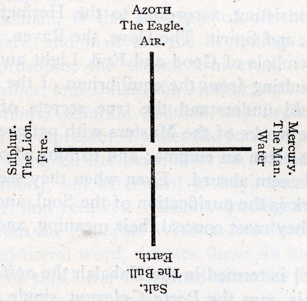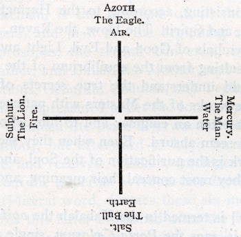"To these three substances allude the three golden basins, in the first of which was engraved the letter M∴, in the second, the letter G∴, and in the third nothing. The first, M∴, is the initial letter of the Hebrew word Malakh, which signifies Salt; and the second, G∴, of the Hebrew word Geparaith, which signifies Sulphur; and as there is no word in Hebrew to express the vaporous and intangible Spirit, there is no letter in the third basin. "With these three principal substances you may effect the transmutation of metals, which must be done by means of the five points or rules of the Scottish Mastership. "The first Master's point shows us the Brazen Sea, wherein must always be rain-water; and out of this rain-water the Scottish Masters extract the first substance, which is Salt; which salt must afterward undergo a seven-fold manipulation and purification, before it will be properly prepared. This seven-fold purification is symbolized by the Seven Steps of Solomon's Temple, which symbol is furnished us by the first point or rule of the Scottish Masters. "After preparing the first substance, you are to extract the second, Sulphur, out of the purest gold, to which must then be added the purified or celestial Salt. They are to be mixed as the Art directs, and then placed in a vessel in the form of a SHIP, in which it is to remain, as the Ark of Noah was afloat, one hundred and fifty days, being brought to the first damp, warm degree of fire, that it may putrefy and produce the mineral fermentation. This is the second point or rule of the Scottish Masters." If you reflect, my Brother, that it was impossible for any one to imagine that either common salt or nitre could be extracted from rain-water, or sulphur from pure gold, you will no doubt suspect that some secret meaning was concealed in these words. The Kabalah considers the immaterial part of man as threefold, consisting of NEPHESCH, RUACH, and NESCHAMAH, Psyche, Spiritus, and Mens, or Soul, Spirit, and Intellect. There are Seven Holy Palaces, Seven Heavens and Seven Thrones; and Souls are purified by ascending through Seven Spheres. A Ship, in Hebrew, is Ani; and the same word means I, Me, or Myself. The RITUAL continues: "Multiplying the substance thus obtained, is the third operation, which is done by adding to them the animate, volatile Spirit; which is done by means of the water of the Celestial Salt, as well as by the Salt, which must daily be added to it very carefully, and strictly observing to put neither too much nor too little; inasmuch as, if you add too much, you will destroy that growing and multiplying substance; and if too little, it will be self-consumed and destroyed, and shrink away, not having sufficient substantiality for its preservation. This third point or rule of the Scottish Masters gives us the emblem of the building of the Tower of Babel, used by our Scottish Masters, because by irregularity and want of due proportion and harmony that work was stopped; and the workmen could proceed no further. "Next comes the fourth operation, represented by the Cubical Stone, whose faces and angles are all equal. As soon as the work is brought to the necessary point of multiplication, it is to be submitted to the third Degree of Fire, wherein it will receive the due proportion of the strength and substance of the metallic particles of the Cubical Stone; and this is the fourth point or rule of the Scottish Masters. "Finally, we come to the fifth and last operation, indicated to us by the Flaming Star. After the work has become a duly-proportioned substance, it is to be subjected to the fourth and strongest Degree of fire, wherein it must remain three times twenty-seven hours; until it is thoroughly glowing, by which means it becomes a bright and shining tincture, wherewith the lighter metals may be changed, by the use of one part to a thousand of the metal. Wherefore this Flaming Star shows us the fifth and last point of the Scottish Masters. "You should pass practically through the five points or rules of the Master, and by the use of one part to a thousand, trans-mute and ennoble metals. You may then in reality say that your age is a thousand years." In the oration of the Degree, the following hints are given as to its true meaning: "The three divisions of the Temple, the Outer Court, Sanctuary, and Holy of Holies, signify the three Principles of our Holy Order, which direct to the knowledge of morality, and teach those most practical virtues that ought to be practised by mankind. Therefore the Seven Steps which lead up to the Outer Court of the Temple, are the emblem of the Seven-fold Light which we need to possess, before we can arrive at the height of knowledge, in which consist the ultimate limits of our order. "In the Brazen Sea we are symbolically to purify ourselves from all pollutions, all faults and wrongful actions, as well those committed through error of judgment and mistaken opinion, as those intentionally done; inasmuch as they equally prevent us from arriving at the knowledge of True Wisdom. We must thoroughly cleanse and purify our hearts to their inmost recesses, before we can of right contemplate that Flaming Star, which is the emblem of the Divine and Glorious Shekinah, or presence of God; before we may dare approach the Throne of Supreme Wisdom." In the Degree of The True Mason [Le Vrai Maçon], styled in the title-page of its Ritual the 23d Degree of Masonry, or the 12th of the 5th class, the Tracing-board displays a luminous Triangle, with a great Yōd in the centre. "The Triangle," says the Ritual, "represents one God in three Persons; and the great Yōd is the initial letter of the last word. "The Dark Circle represents the Chaos, which in the beginning God created. "The Cross within the Circle, the Light by means whereof He developed the Chaos. "The Square, the four Elements into which it was resolved. "The Triangle, again, the three Principles [Salt, Sulphur, and Mercury], which the intermi