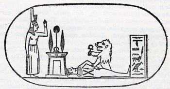 So, in Arabic, hrm, an unused root, meant, "was high," "made great," "exalted;" and Hîrm means an ox, the symbol of the Sun in Taurus, at the Vernal Equinox. KHURUM, therefore, improperly called Hiram, is KHUR-OM, the same as Her-ra, Her-mes, and Her-acles, the "Heracles Tyrius Invictus," the personification of Light and the Son, the Mediator, Redeemer, and Saviour. From the Egyptian word Ra came the Coptic Oūro, and the Hebrew Aūr, Light. Har-oeri, is Hor or Har, the chief or master. Hor is also heat; and hora, season or hour; and hence in several African dialects, as names of the Sun, Airo, Ayero, eer, uiro, ghurrah, and the like. The royal name rendered Pharaoh, was PHRA, that is, Pai-ra, the Sun. The legend of the contest between Hor-ra and Set, or Set-nu-bi, the same as Bar or Bal, is older than that of the strife between Osiris and Typhon; as old, at least, as the nineteenth dynasty. It is called in the Book of the Dead, "The day of the battle between Horus and Set." The later myth connects itself with Phœnicia and Syria. The body of OSIRIS went ashore at Gebal or Byblos, sixty miles above Tsūr. You will not fail to notice that in the name of each murderer of Khūrūm, that of the Evil God Bal is found. *** Har-oeri was the god of TIME, as well as of Life. The Egyptian legend was that the King of Byblos cut down the tamarisk-tree containing the body of OSIRIS, and made of it a column for his palace. Isis, employed in the palace, obtained possession of the column, took the body out of it, and carried it away. Apuleius describes her as "a beautiful female, over whose divine neck her long thick hair hung in graceful ringlets;" and in the procession female attendants, with ivory combs, seemed to dress and ornament the royal hair of the goddess. The palm-tree, and the lamp in the shape of a boat, appeared in the procession. If the symbol we are speaking of is not a mere modern invention, it is to these things it alludes. The identity of the legends is also confirmed by this hieroglyphic picture, copied from an ancient Egyptian monument, which may also enlighten you as to the Lion's grip and the Master's gavel.