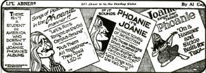 QUESTION, THEY EXPECT A REPLY! DOESN'T MATTER IF YOU'RE FIXIN' TO DIE. Folk singer Joan Baez, a distinguished critic of the Sturm and Drang in Southeast Asia, survived the CHAOS backlash. Unlike many of the musicians who fell under the heel of the mammoth inter-agency operation, she fully understood that political assassination could be her reward for openly castigating military-industrial masters of war. Her close friend Martin Luther King, Jr. climbed to the "mountaintop." She met him on the descent. The world's most honored civil rights leader explained to Baez and a group of activist supporters before delivering the famed speech how he came to scale the "mountaintop." "[He] told us how it happened. It was when he was in solitary confinement in Alabama or someplace. [The police] had dumped him in the hole, and it was black, he couldn't see And they shoved food into the room, but he was afraid to eat it. Starving, afraid -- he said he got on his knees for hours. 'And when I stood up,' he said, 'it didn't matter anymore.'" King's entourage hid their pain "when we knew what he meant -- we knew he was going to die. And he was ready to die, and he was ready to make his commitment about Vietnam -- which is why he died. 'I've been to the mountaintop, and I've seen the promised land, and it doesn't matter anymore.'" [1] King's example left Baez with a personal and highly instructive vantage point to view the pathological drives of the intelligence sector's bloodhounds, but she already had a jump on most activists -- she was to the national security state born. Baez wrote in a memoir, And a Voice to Sing With (1987), of her childhood and her father, a "bright young Stanford scientist" who settled in Los Alamos, New Mexico, the incubation chamber of the atomic bomb. Albert Baez "recognized the potential destructive power of the unleashed atom even in those early days. So he took a job as a research physicist at Cornell University in Ithaca, New York: Cornell was the home base of the CIA's mind control experiments, and Joan Baez is a survivor of ritual child abuse and a multiple personality, according to letters she has written to researchers and other survivors, a common cover for trauma-based mind control programming (she has sung about it: "I'm paying for protection/Smoking out the truth/Chasing recollections/Nailing down the proof ..." [2]) Baez entertained no delusions about the CIA. In San Francisco, she once promoted State of Seige, a film, she said later, that "exposed, among other things, the corrupt element in the AID program which funded the teaching of torture techniques in Latin America. We solicited signatures against the use of torture." She informed these signatories, "Torture was more prevalent than it had been since the middle ages, thus the danger was its common use as government policy," and, "though at one remove, the hands of the US government were far from clean." [3] The psychological cost of ritual abuse/mind control experimentation as a child, and decades of civil rights activism, has been years of intensive therapy to confront her "inner demons," her fears, insomnias, panic attacks, phobias, and anxieties. Therapists kept Baez "glued together, to get me to the next gig, or to the next march." [4] Joan's father, a Quaker by religious conversion, "was invited to become Head of Operations Research at Cornell." This position and a security pass would almost certainly bring him into contact with the CIA's Human Ecology Fund, the contract base for all classified academic mind control studies sequestered behind the privet fences of Ivy League campuses across the country. "Exactly what the job entailed was classified information," Baez recalls, but her father was "offered a three-week cruise on an aircraft carrier as an introduction to the project and promised a huge salary. As it turned out, he would be overseeing Project Portrex, a vast amphibious exercise which among other things involved testing fighter jets, then a relatively new phenomenon. Millions of dollars would be poured into the project, about which he was to know little and say less." [5] After high school, her father moved on to MIT, another fount of classified military research. [6] At the age of ten, she lived in Baghdad, Iraq with her family. Upon their return to the U.S., the Baez family moved to California. LI'L ABNER, BY AL CAPP: THERE ISN'T A STUDENT IN AMERICA WHO DOESN'T OWN JOANIE PHOANIE'S ALBUMS: SONGS OF PEACE IN THE PHOANIE MANNER!! "LET'S RIOT TONIGHT ON THE OLD CAMPUS GROUND." "PUT THEM ALL TOGETHER -- THEY SPELL LSD!!" IF IT SOUNDS PHOANIE IT'S JOANIE. PHOANIE SONGS OF PATRIOTISM. "LAY THOSE WEAPONS DOWN, MCNAMARA." "THROW ANOTHER DRAFT CARD ON THE FIRE!!" "LET'S CONGA WITH THE VIET CONG." JOANIE SINGS HER LATEST PHOANIE. "ON A HAMMER AND SICKLE BUILT FOR TWO" -- SOME RIGHT-WINGERS FOUND THE MUSIC OF JOAN BAEZ LESS THAN INSPIRATIONAL She was not buried by CHAOS, but she lived under its intolerant eye and it could silence her: "An American," the New York Times reported on February 21, 1967, "identifying himself as Harold Cooper, a CIA man, had ordered the Japanese interpreter, Ichiro Takasaki, to substitute an innocuous translation in Japanese for Miss Baez' remarks in English on Vietnam and Nagasaki's atom bomb survivors." Cooper asked Takasaki to revise political statements made by the folk singer, and warned, "If you don't cooperate, you will have trouble in your work in the future." The interpreter cooperated and mistranslated her statements. "It was a most strange case," Takasaki told reporters "I knew that Miss Baez was a marked person who was opposed to the Vietnam War and who had been tacitly boycotted by the broadcasting companies in the United States. American friends also repeatedly advised me not to take on the job, but I took it on as a business proposition, since the Japanese fans were coming not to hear her political statements, but her music. I met Mr. Cooper once in the presence o