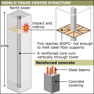 Images cached from BBC page ( http://news.bbc.co.uk/hi/english/world/americas/newsid_1540000/1540044.stm or http://www.public-action.com/911/jmcm/BBCNews ) and HERA report by G. Charles Clifton ( http://www.hera.org.nz/PDF%20Files/World%20Trade%20Centre.pdf or http://www.public-action.com/911/jmcm/clifton.pdf ). Items indicated in Clifton image (right): 13. Exterior columns; 17. Interior columns; 20. Usable office space BBC News Image (left) is misleading: 1. A "beam" is always horizontal, "columns" are vertical. The vertical steel supports in the core were columns. 2. The central columns occupied about 25% of the floor area, not 10% as is shown on the left. 3. The central columns were not encased in a single block of concrete, but interspersed with elevator shafts
