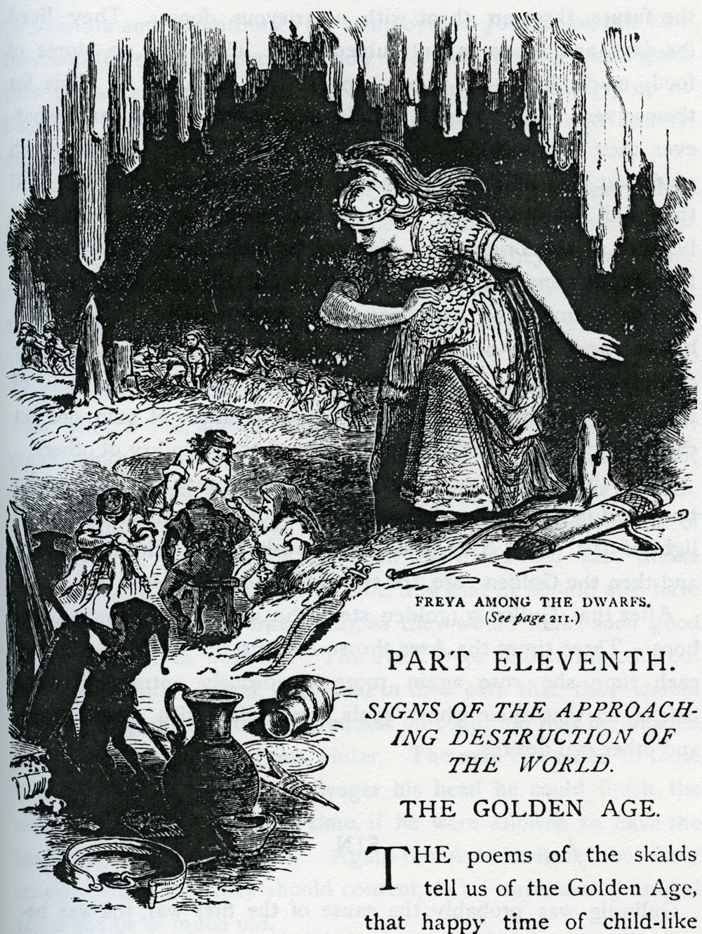 Freya Among the Dwarfs PART ELEVENTH: SIGNS OF THE APPROACHING DESTRUCTION OF THE WORLD The Golden Age ― 265, Sin ― 266, Iduna’s departure ― 270 THE GOLDEN AGE The poems of the skalds tell us of the Golden Age, that happy time of child-like innocence. No human being lived then on the green earth, which was inhabited by the Ases, who dwelt there without restrictions of any kind, or any longing after the unattainable. They had no past dimmed with tears, no difficulties in the present, nor did the future threaten them with a grievous doom. They lived for days and years in untroubled joy. They laid up stores of food, made hammers, tongs, anvils and tools of all kinds for themselves. They forged metals and carved wood, and whatever they did was beautiful to look upon. They had so much gold that they used it for making their household utensils. Still they did not know the value of the metal, and only liked it because it was bright and pleasant to look upon. They called this happy time the Golden Age, because life was then without care or sorrow, and not because of their wealth. They built houses and holy-places for themselves; they played merry games with golden disks in the court-yard and on the Field of Ida. They felt neither love of money nor desire of gain, nor yet did they ever wish to do themselves good to the injury of others. Then they jestingly created the numerous race of Dwarfs, who burrowed in the earth and brought its hidden treasures forth to the light of day. The Ases looked covetously at the glittering hoard, and then the Golden Age, the time of innocence, passed away. After that Gullweig (golden step), the wicked enchantress, was born. Three times the Ases thrust her into the smelting- pot, and each time she rose again more wondrously entrancing than before, so that their whole souls were filled with covetousness and other evil desires. SIN Gullweig was probably the cause of the first war, the war between the Ases and Wanes. She glided about from one camp to the other stirring up dissension. But fortunately peace was soon concluded. The eyes of the gods were now opened, so that they perceived the danger that threatened them. They saw the Mountain-Giants and Hrimthurses far away over in Jotunheim, saw how they had increased in numbers, how they had already made good their entrance into Midgard, and were looking threateningly up at beautiful Asgard, with its palaces, perfumed groves and flowery meads. Heimdal was a faithful watchman, but still the Ases feared lest he should be taken unawares. So they assembled in their hall of judgment, and took counsel together how best they might ensure their safety. It seemed to them that their surest plan would be to build a wall round Asgard, reaching to the skies, in which strong doors should be placed. While they were consulting as to the best way of carrying out their plan, a tall, stately man, with a disagreeable expression of countenance, came up and offered to complete the wall, without help from any one, in three winters. He said that he was a smith, a very skilful man, and that he thoroughly understood the art of building. In payment for his work he demanded that divine Freya should be given him to wife, and that he should also have the sun and moon awarded him, as they would make such good lights for him to work by. The Ases were undetermined; but Loki, the arch-scoundrel, whispered in their ears that they should promise to grant the builder’s request on condition that he finished the work in the course of one winter. The man consented to these terms, saying that he would wager his head he could finish the ork within the appointed time, if he were allowed to have the help of his horse Swadilfari. Again the Ases hesitated, but Loki strongly urged that they should consent, as an unreasoning animal could not be of much use. So the bargain was concluded, and each party swore holy oaths by dark Hel, by the Leipter Flood and the primaeval icebergs, that the conditions made on either side should be fulfilled faithfully and truly. The work was begun on the first day of winter. The Ases saw what monstrous loads of rocks and stones the builder’s horse carried, swift as the wind, wherever his master desired. The wall grew apace, and was strong and solid as an iceberg. It was as smooth and shining as polished steel, and at the end of winter it was nearly finished. The great gate of the fortress was now alone to be made, and that could be easily done in the three days that were still to elapse before the beginning of summer. The Ases consulted together in their distress, for if the smith were to carry Freya and the sun and moon away with him in payment for his work, beauty and sweetness would vanish from Asgard, and eternal night would overwhelm the world. Many of the gods longed for the presence of strong Thor, who had been far away waging war on monsters of all kinds when the contract was made with the smith, and who had not yet returned. They seated themselves on their thrones of judgment, and tried to find a way out of their difficulty. They asked each other who it was that had advised them to conclude the bargain with the smith. Every one knew that it was the author of all evil ― false, treacherous Loki. Then they all crowded round him accusing and threatening him. “Let him die a shameful death,” they cried, “if he does not help us out of our difficulty.” Loki tremblingly promised, with a holy oath, that he would prevent the builder finishing the wall, and would thus deprive him of his reward. The next day, when the smith went to the mountains with Swadilfari, to fetch stones and wood for his work, a mare galloped towards them whinnying. Immediately the horse rushed to meet her, kicking the cart and harness in pieces. He followed the flying mare through wood and meadow, pursued by the breathless smith. The pursuit lasted the whole day and night, and when the builder at length succeeded in catching his horse they were 