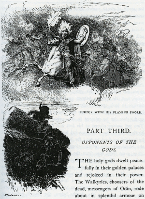 Surtur With His Flaming Sword PART THIRD: OPPONENTS OF THE GODS Loki and his kindred ― 53, The giants ― 55, Muspel and his sons ― 56, Surtur ― 57 The holy gods dwelt peacefully in their golden palaces and rejoiced in their power. The Walkyries, choosers of the dead, messengers of Odin, rode about in splendid armour on their white horses. They bore the hero-spirits they had taken from bloody battlefields back with them to Asgard. On reaching the grove Glasir, they dismounted from their horses, and led the heroes under the shade of its golden foliage to Walhalla. There the mists of death passed from the eyes of the warriors; they recognised the hall intended for them on seeing Odin’s coat of arms, the wolf and the eagle. They saw the roof made of the shafts of spears covered with shields, and the seats spread with soft chainmail. Weapons flashed as they entered, and foaming goblets were emptied in their honour by the great band of heroes, who had reached the halls of blessedness before them. And they drank of the sweet mead provided for them by the goat Heidrun, and feasted on the roasted flesh of the boar Sährimnir, which was restored to life every evening, that it might again furnish a repast for the heroes on the following day. The ruling gods sat on twelve thrones, and highest amongst them was Odin in all his glory, his spear Gungnir in his right hand, and his golden helmet on his head. He was not now terrible to look upon, as when he led armies on to battle or when he hurled the death-spear over their ranks; a gentle smile lighted up his face, for he rejoiced in the arrival of the noble warriors. Two pet wolves played at his feet and fawned upon him, when he threw them the food provided for himself at the board. For he needed no food to eat; for him it was sufficient to drink of the blood-red wine, which refreshed and strengthened his mind. Then great Odin rose from the board, walked through the hall, and went to his throne Hlidskialf, all Asgard trembling beneath his tread. He seated himself, and gazed thoughtfully over the worlds. Far away in the distance gleamed Muspelheim, where dark Surtur, flame-girdled, and holding his fiery sword in his hand, watched his opportunity as yet in vain; in Midgard were the mortal men; in the depths below, the Dwarfs toiled and laboured. The mighty god’s two ravens, Hugin (thought) and Munin (memory), flew quickly up to him; they perched one on his right shoulder and the other on his left, and whispered in his ears the secrets they had heard during their flight through the worlds. Anxiously the monarch turned his gaze towards Jotunheim, for things were going on there which threatened the general peace. LOKI AND HIS KINDRED In the grey twilight enveloping the giants’ world, the king recognised his old comrade Loki, with whom he had sworn brotherhood at the beginning of time. Loki had set up house in Jotunheim and had married the dreadful giantess Angurboda (bringer of anguish). They had three children, all horrible monsters: the Wolf Fenris, the Snake Jörmungander, and terrible Hel, at the sight of whom all living creatures stiffened in death. One side of her face was of corpse-like pallor, and the other was dark as the grave. The young wolf was not less appalling to look upon, when he opened wide his blood-red jaws to devour the food his father offered him; nor the snake which wound itself round Angurboda as though desirous of crushing her to death in its coils. Allfather turned away from the horrible sight with a shudder of disgust, and saw his bright son Hermodur standing before him. Pointing down at Jotunheim, he desired him to bear his commands to the gods, that they should at once go and bring him the brood of giants. In obedience to the king’s orders, the powerful gods at once arose, and with brave Tyr at their head, crossed the bridge Bifröst and the river Ifing, and so reached the inhospitable land of the Hrimthurses. Loki was beautiful like all the gods, but his heart was full of guile. They found him in the court-yard of his castle. He went on playing with his monstrous progeny, and took no notice of the messengers, until they approached quite close to him, and made known the commands of Odin. He would have refused to obey, but strong Tyr shook his fist threateningly, upon which he gave way, and followed them to Asgard, accompanied by his children. He was immediately brought before the king’s throne. Terrible Hel grew visibly more gigantic, lightnings flashed from her deepset eyes, and she stretched out her arms as though she wished to destroy the great Father. At the same moment Jörmungander reared her head in the air, till she resembled a twisted column, gnashed her jaws and emitted a venomous foam, before which the very gods shrank back. But the king seized both monsters in his powerful arms, and flung them far out of Asgard into immeasurable space. Hel sank nine days’ journey past the bogs, morasses, and rocks of ice in Nifelheim, past the river Giöll and down into the kingdom of Helheim, which was allotted to her, and where she henceforth ruled over the dead. But the Snake fell into the ocean that flows round Midgard. Hidden in its depths, and unseen by gods and men, she was to grow, until, after having twisted herself into innumerable coils, her ugly head should touch the tip of her tail. Then, at last, when the twilight of the gods (the judgment of the gods) should come to pass, she was again to rise, and help to bring about the destruction of the worlds. When the Wolf saw his playfellows flung out of Asgard, he began to howl so loud, that his voice was heard over in Jotunheim. Yet he did not venture to resist, and great Tyr bore him away from before the face of the angry Father, away from the heavenly towers, to where the hills of Asgard slope towards Midgard; there he brought him food every day. Odin still remained on Hlidskialf, thinking of all, caring for all. The gods stood silently around him; but Loki