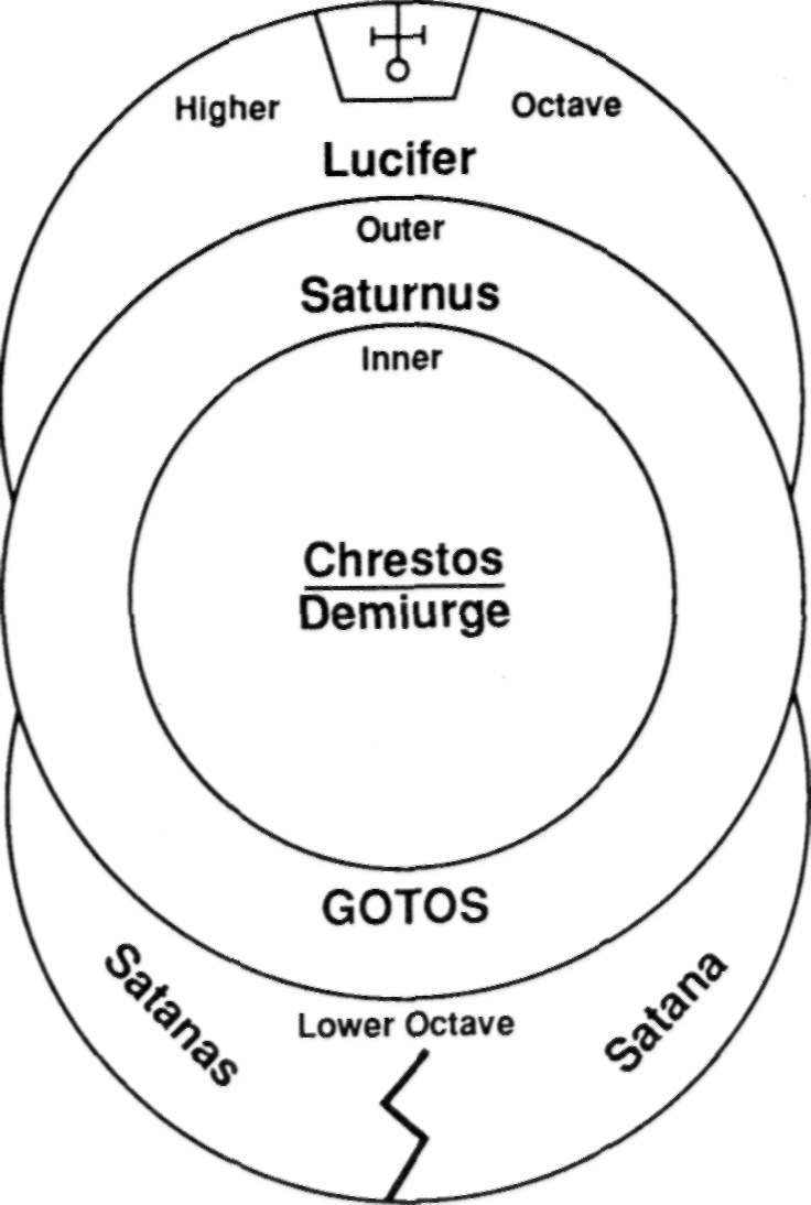 As has been intimated, the outer and ruling aspect of the planetary genius is that of Saturn with all its previously outlined characteristics. A part of this is the egregore of the FS itself—the GOTOS. Deep within there is, however, the creative solar spark called the Chrestos-Principle. [54] These two aspects can work harmoniously and consciously together in the controlled sphere of Saturn. This enlightened state is facilitated especially when harmony with the higher octave of the planet, Lucifer—the Light-Bearer—is concentrated on. The higher octave is also harmonized with the planetary spirit of Uranus, with which Saturn works for the current aeonic transformation. In the lower octave, Saturn is connected to the Satanic force. This is the power of rebellion, adversity, and death, all of which are absolutely necessary to man's path of attainment—to his Becoming. However, this purely "Satanic" aspect can be ultimately as dangerous and destructive to consciousness as is the self-obliterating power of the Sun. The Saturnian brother must remain concentrated on the higher octave in order to remain fully conscious and independent (consistent with the Luciferian Principle), and not fall into the lower to become a mere tool of the Demiurge.