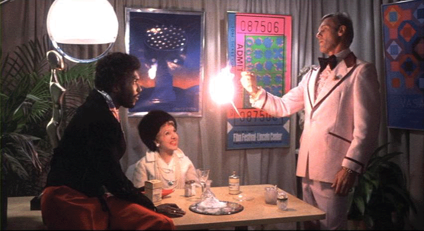 first-run art films here. [Francine Fishpaw] OK, but hurry. I don't want to be late for Cuddles' party. [Flashlight] Hey, what's happenin', Todd? [La Rue] Hi, darling. [Todd Tomorrow] Right there. [Flashlight] How you doin', my man? [Todd Tomorrow] Not bad. [Flashlight] Here you go. [La Rue] Nose candy. [Todd Tomorrow] Yeah, sweets for the sweet. [La Rue] Dynamite! [Francine Fishpaw reading magazine CAHIERS DU CINEMA 314] [La Rue] Free basing! [Flashlight] Let's do it, Todd, baby. [La Rue] Go get her, honey! [Todd Tomorrow] Right after I blast off.