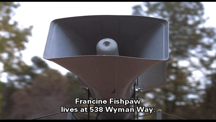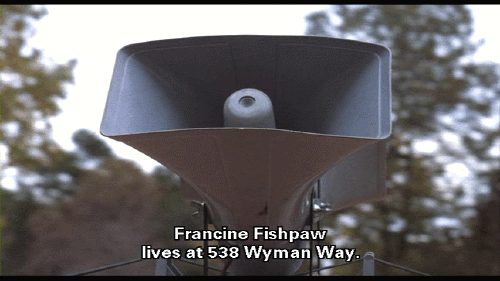 [Francine Fishpaw] [Sobbing] [Elmer Fishpaw] [On Loudspeaker] Francine Fishpaw lives at 538 Wyman Way. She weighs 300 pounds ... and is an alcoholic. Ha, ha, ha, ha, ha. She eats an entire cake at one sitting. You should see her stretch marks. Because of her drunkenness ...
