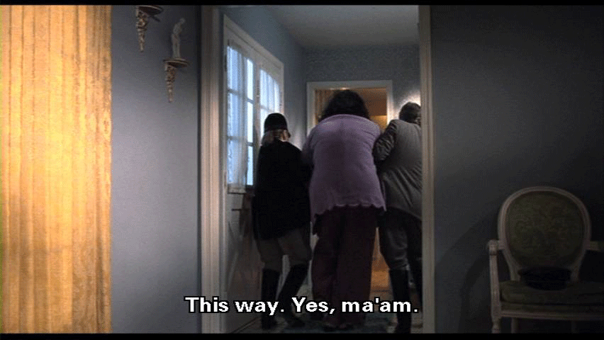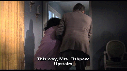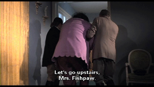 [Heintz] Mrs. Fishpaw, come on, let's go. This way, Mrs. Fishpaw. Upstairs. Let's go upstairs, Mrs. Fishpaw. [Francine Fishpaw] Upstairs? [Heintz] This way. Yes, ma'am.