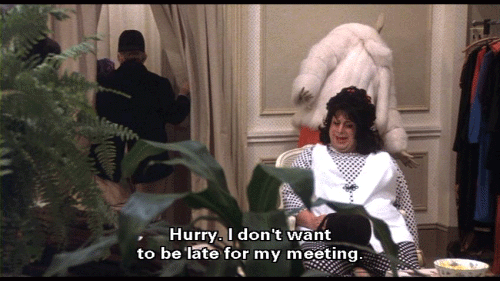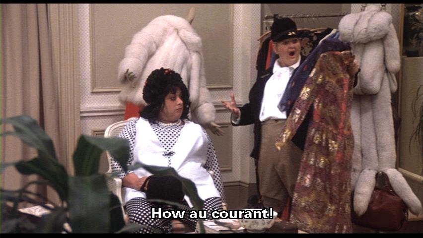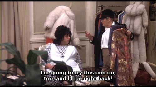How au courant! I'm going to try this one on, too, and I'll be right back! Oh! This place is glamorous! [Francine Fishpaw] Hurry. I don't want to be late for my meeting. [Cuddles Kovinsky] God! Damn these designers!