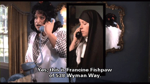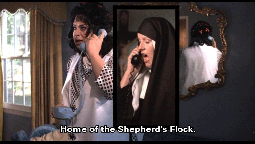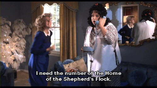 Yes, I need the number of the Home of the Shepherd's Flock Lu-Lu, stop it. Thank you. Lu-Lu, stop! [Nun 1] Home of the Shepherd's Flock. [Francine Fishpaw] Yes, this is Francine Fishpaw of 538 Wyman Way. I need an unwed mothers home.