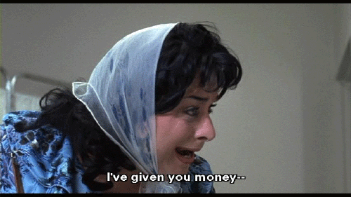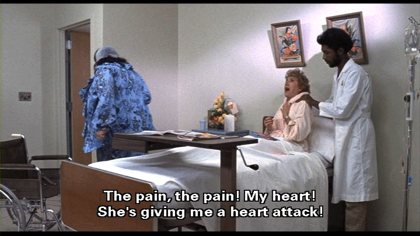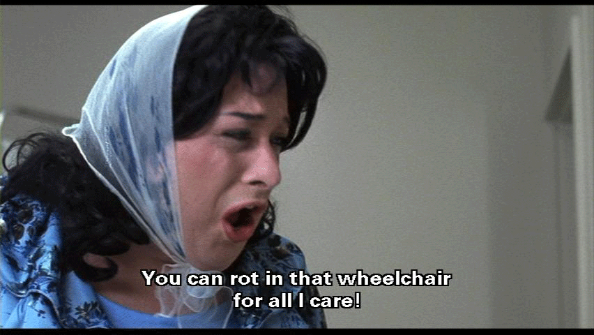I've given you money -- thousands and thousands of dollars -- and still it's not enough! Well, I've had it. You can rot in that wheelchair for all I care! [La Rue] The pain, the pain! My heart! She's giving me a heart attack! Oh, God, help! Help!