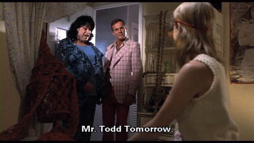 [Todd Tomorrow] I can hardly wait. [Francine Fishpaw] Oh, OK. Follow me. [Todd Tomorrow] Stunning. [Lu-Lu Fishpaw] Hi, Mom. [Francine Fishpaw] Lu-Lu, I'd like you to meet a friend of mine -- Mr. Todd Tomorrow.