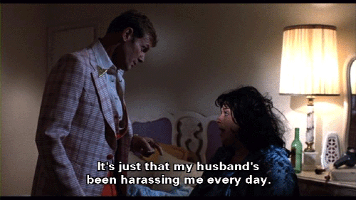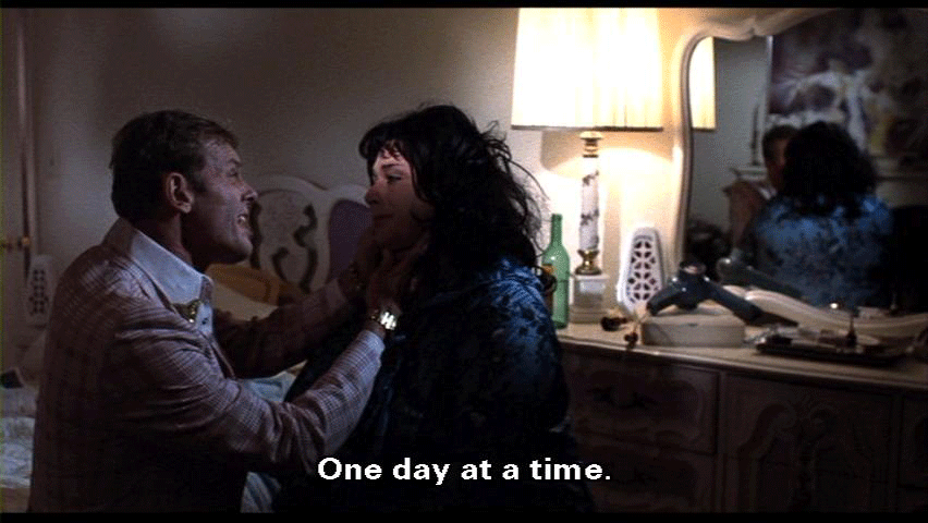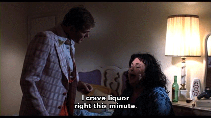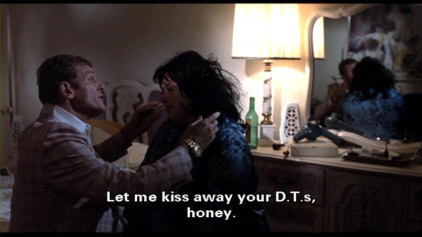 It's just that my husband's been harassing me every day. I can't help it. I'm afraid he's going to kill me! I crave liquor right this minute. [Todd Tomorrow] Easy does it, baby. One day at a time. [Francine Fishpaw] I ache. I ache all over. [Todd Tomorrow] Let me kiss away your D.T.s, honey.