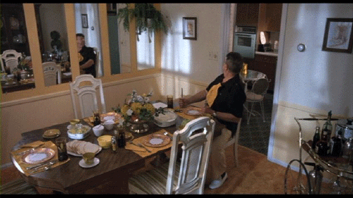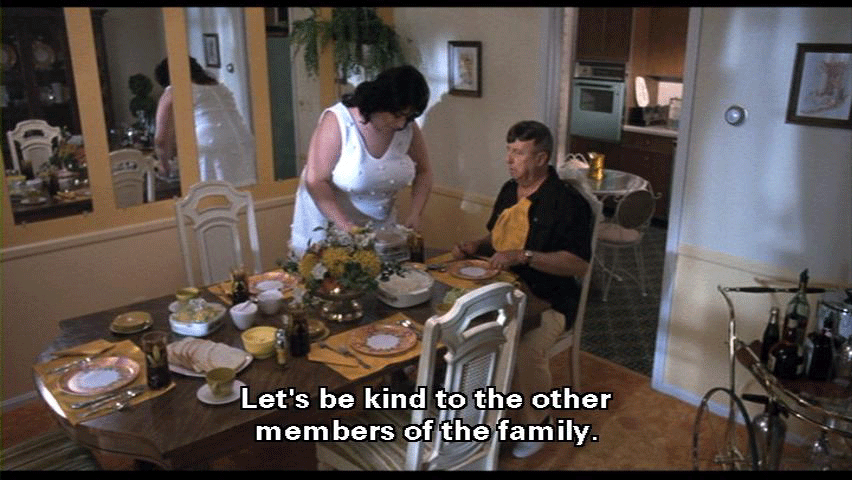 [Elmer Fishpaw] I'm in here waiting for it! [Francine Fishpaw] Elmer, let's try and have a pleasant family dinner. Let's be kind to the other members of the family. [Elmer Fishpaw] I'll try, Francine, but don't go riling me up. Choose your words with care, and I won't get riled.