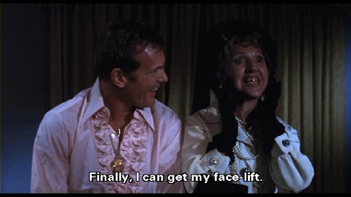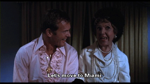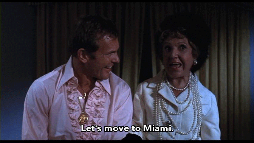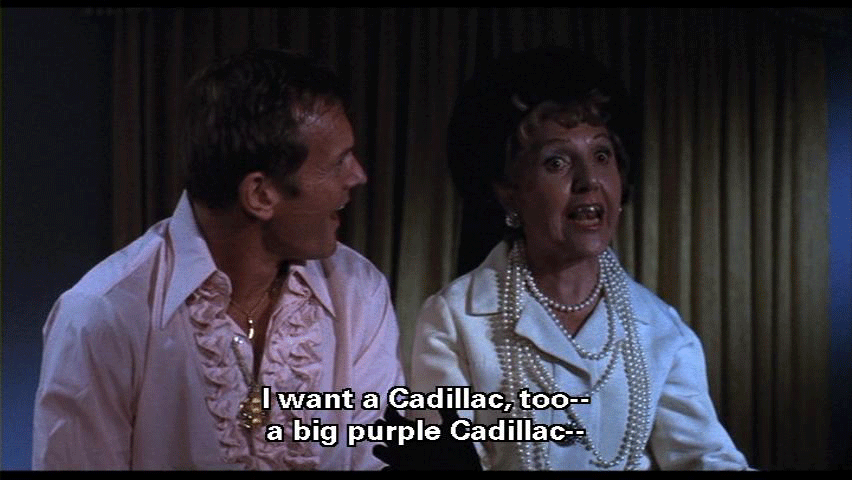 [Francine Fishpaw] [Making Ape Sounds] [La Rue] Let's move to Miami. Finally, I can get my face-lift. I want a Cadillac, too -- a big purple Cadillac -- so I can ride around and laugh at poor people. [Francine Fishpaw] [Making Chicken Sounds]