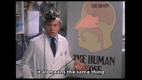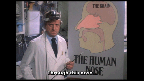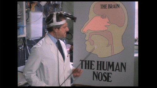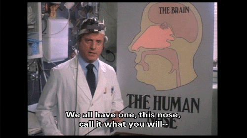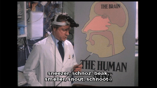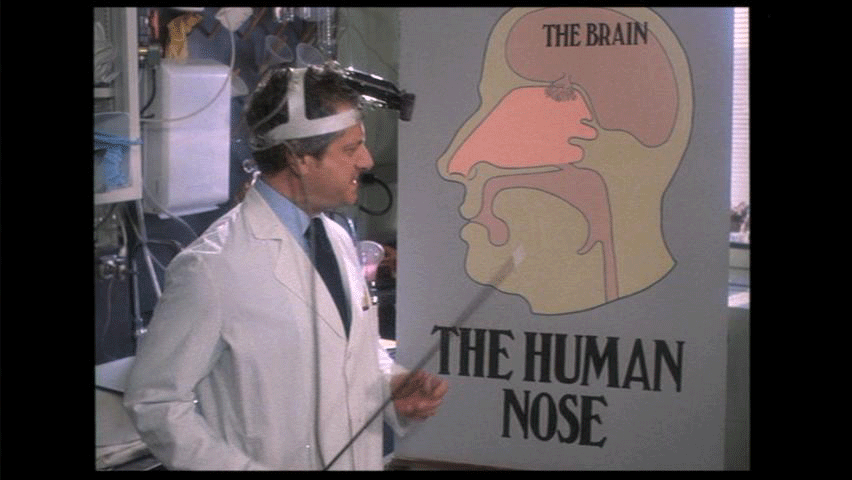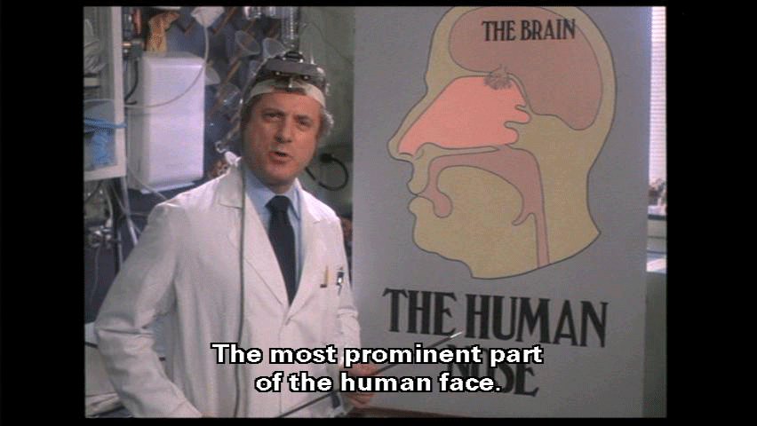 The most prominent part of the human face. It bears the nostrils und covers the nasal passages. We all have one, this nose, call it what you will -- sneezer, schnoz, beak, smeller, snout, schnoot -- it all means the same thing. Through this nose ... comes some of life's most rewarding sensations ...