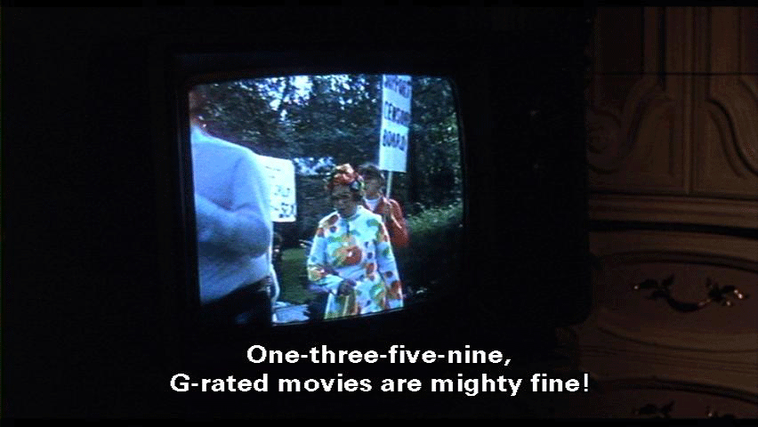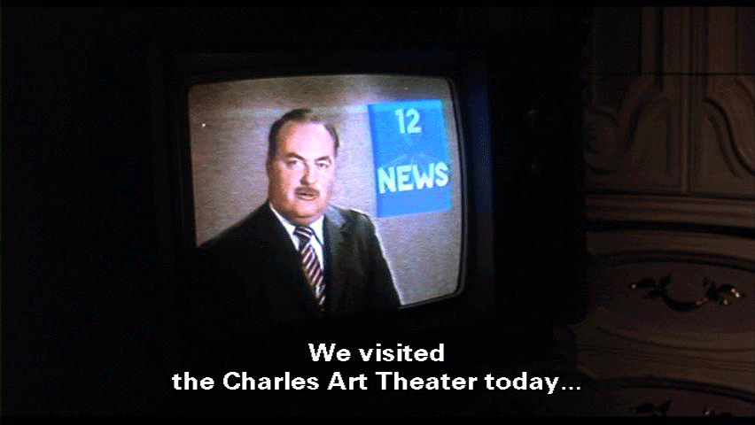 One-three-five-nine, G-rated movies are mighty fine! [TV Reporter] The pickets, led by Mrs. Jeanette Smise of Townsend ... feel he should change the theater's policy ... by showing only G-rated family movies. [Jeannette Smise] His theater caters to sex offenders. [TV Reporter] We visited the Charles Art Theater today ... but were unable to find a ticket buyer ... willing to be interviewed on camera.