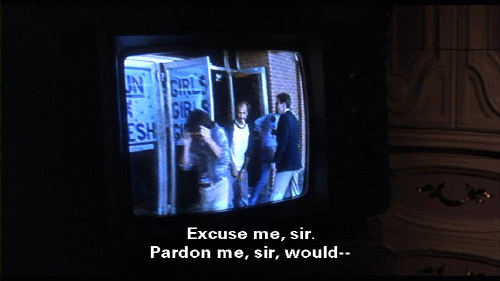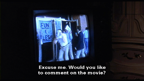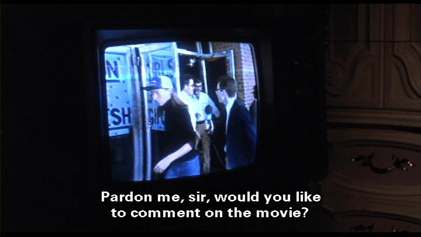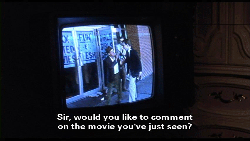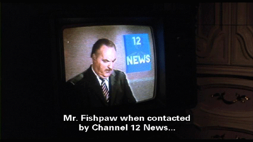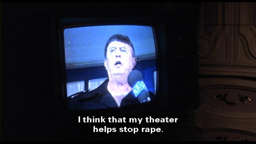 [Reporter] Sir, would you like to comment on the movie you've just seen? Excuse me, sir. Pardon me. Would you like to comment on the movie? Excuse me, sir. Pardon me, sir, would -- Pardon me, sir, would you like to comment on the movie? [TV Reporter] Mr. Fishpaw when contacted by Channel 12 News ... [Elmer Fishpaw] Here I am! [TV Reporter] ... responded to the protesters. [Elmer Fishpaw] I think that my theater helps stop rape.