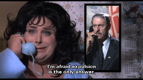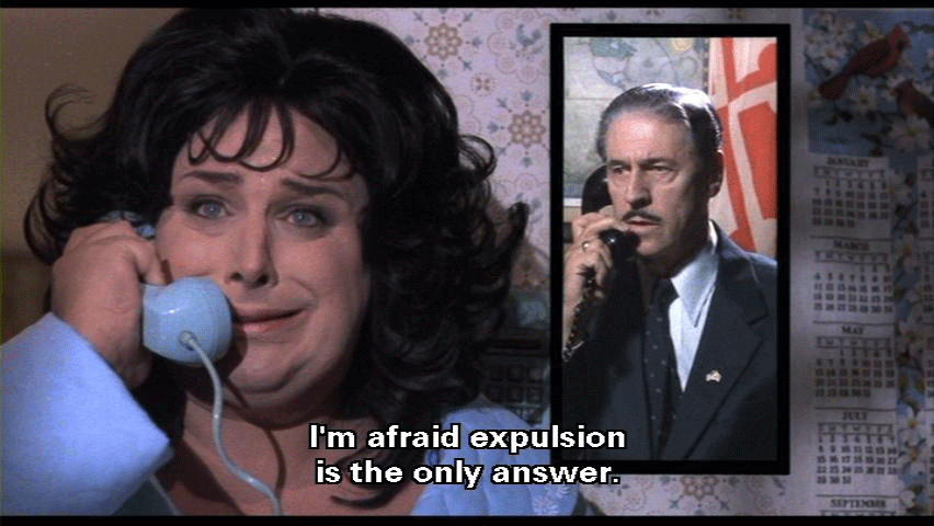 But surely expulsion is not the answer! [Mr. Kirk] I'm afraid expulsion is the only answer. It is the opinion of the entire staff ... that Dexter is criminally insane ... and a hazard to the safety of the other students. We have no choice. I'm sorry. Good day, Mrs. Fishpaw.