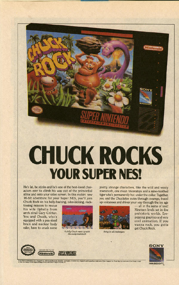 SUPER NINTENDO ENTERTAINMENT SYSTEM SONY IMAGESOFT CHUCK ROCKS YOUR SUPER NES! He's fat, he stinks and he's one of the best-loved characters ever to climb his way out of the primordial slime and onto your video screen. In this rockin' new 16-bit adventure for your Super NES, you'll join Chuck Rock on his belly-bashing, odor-kicking, rock-tossing mission to rescue his wife Ophelia from arch-rival Gary Gritter. You and Chuck, who's equipped with a pea-sized brain and nuclear body odor, have to crush some pretty strange characters, like the wild and wooly mammoth, one mean triceratops and a saber-toothed tiger who's permanently hot under the collar. Together, you and the Chuckster swim through swamps, travel up volcanoes and shiver your way through the ice age -- all in the name of love! Nineteen levels set in five prehistoric worlds. Eye-popping graphics and very cool animation. If you wanna rock, you gotta get Chuck Rock. |