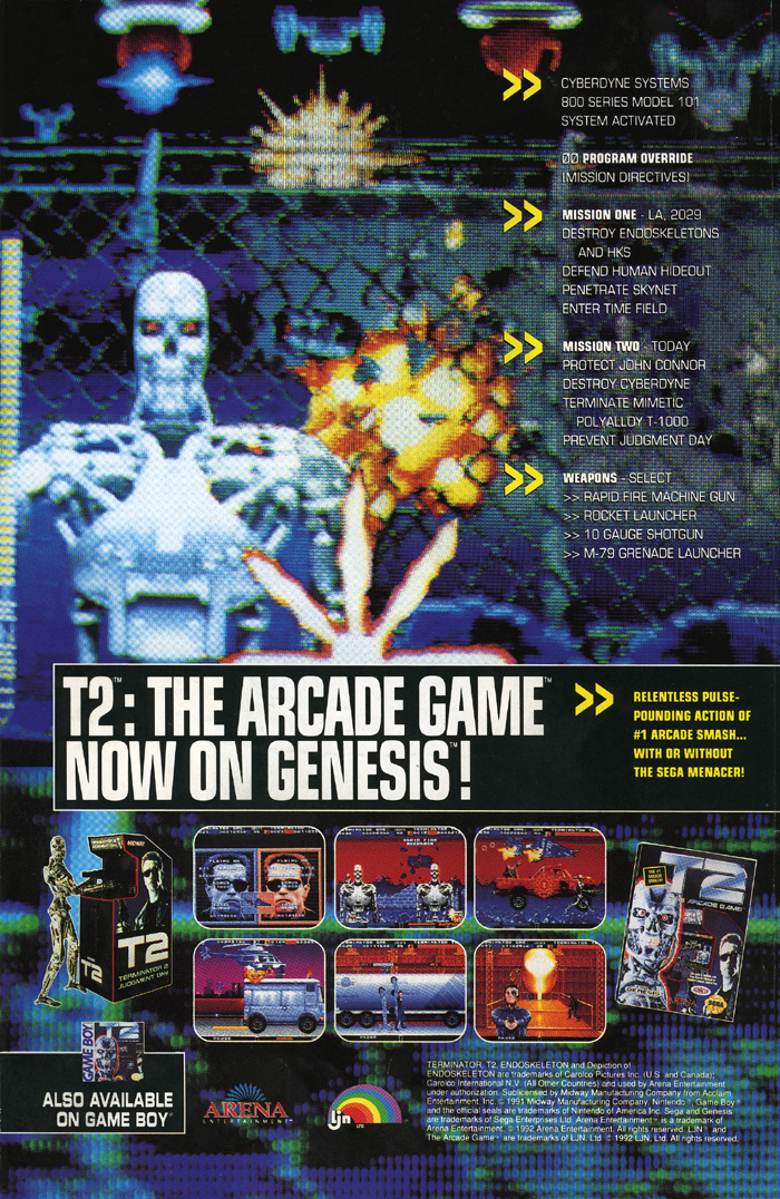 CYBERDYNE SYSTEMS 800 SERIES MODEL 101 SYSTEM ACTIVATED 00 PROGRAM OVERRIDE, MISSION DIRECTIVES! MISSION ONE - LA, 2029, DESTROY ENDOSKELETONS AND HKS, DEFEND HUMAN HIDEOUT, PENETRATE SKYNET, ENTER THE FIELD MISSION TWO - TODAY PROTECT JOHN CONNOR, DESTROY CYBERDYNE, TERMINATE MIMETIC POLYALLOY T-1000, PREVENT JUDGMENT DAY WEAPONS - SELECT RAPID FIRE MACHINE GUN, ROCKET LAUNCHER, 10 GAUGE SHOTGUN, M-79 GRENADE LAUNCHER T2: THE ARCADE GAME NOW ON GENESIS! >> RELENTLESS PULSE-POUNDING ACTION OF #1 ARCADE SMASH ... WITH OR WITHOUT THE SEGA MENACER! |