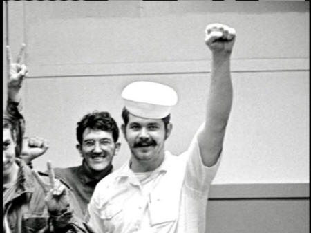 as we sat around and brainstormed about what kind of a non-violent action can we take that can actually touch sailors. CONNIE STAY HOME, DANCING BEAR PRODUCTIONS, 1972: So we looked around and we saw the aircraft carrier, which was the biggest ship in San Diego Harbor ... it's the most impressive symbol of American power. It's hard for people to realize this but that ship is not a naval ship anymore ... it's really part of airpower that we use to attack peasants. It's the weapon of a bully. It's the weapon of aggression. |