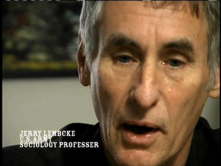 the memory and reality of the GI anti-war movement was being rewritten. HAMBURGER HILL, 1987: They love everybody back there. Cats, dogs, niggers, spics -- they're real fond of the gook back home if you all can believe that. They love everybody but you. JERRY LEMBCKE, U.S. ARMY, SOCIOLOGY PROFESSOR: The typical story of a spat-upon vet is arriving at the San Francisco Airport ... where he is met by demonstrators ... |