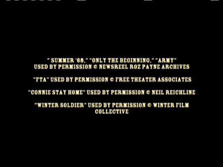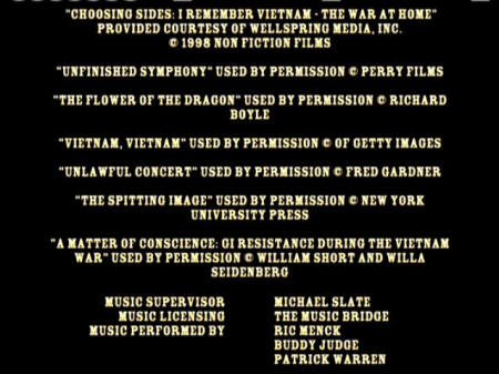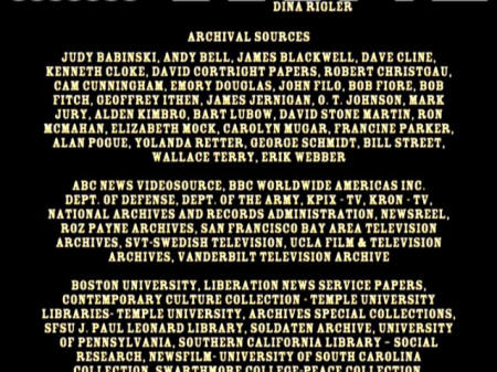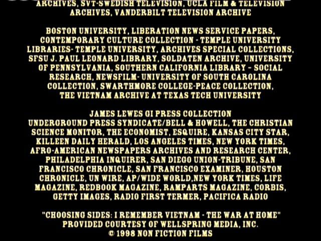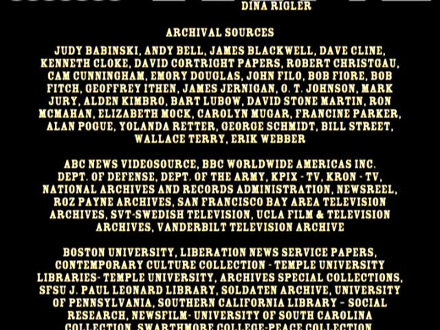 BILL BRYN RUSSELL PUBLICITY: TIM FISHER ARCHIVAL SOURCES: JUDY BABINSKI, ANDY BELL, JAMES BLACKWELL, DAVE CLINE, KENNETH CLOKE, DAVID CORTRIGHT PAPERS, ROBERT CHRISTGAU, CAM CUNNINGHAM, EMORY DOUGLAS, JOHN FILO, BOB FIORE, BOB FITCH, GEOFFREY ITHEN, JAMES JERNIGAN, O.T. JOHNSON, MARK JURY, ALDEN KIMBRO, BART LUBOW, DAVID STONE MARTIN, RON MCMAHAN, ELIZABETH MOCK, CAROLYN MUGAR, FRANCINE PARKER, ALAN POGUE, YOLANDA RETTER, GEORGE SCHMIDT, BILL STREET, WALLACE TERRY, ERIK WEBBE ABC NEWS VIDEOSOURCE, BBC WORLDWIDE AMERICAS INC., DEPT. OF DEFENSE, DEPT. OF THE ARMY, KPIX-TV, KRON-TV, NATIONAL ARCHIVES AND RECORDS ADMINISTRATION, NEWSREEL, ROZ PAYNE ARCHIVES, SAN FRANCISCO BAY AREA TELEVISION ARCHIVES, SVT-SWEDISH TELEVISION, UCLA FILM & TELEVISION ARCHIVES, VANDERBILT TELEVISION ARCHIVE BOSTON UNIVERSITY, LIBERATION NEWS SERVICE PAPERS, CONTEMPORARY CULTURE COLLECTION - TEMPLE UNIVERSITY, LIBRARIES - TEMPLE UNIVERSITY, ARCHIVES SPECIAL COLLECTIONS, SFSU J. PAUL LEONARD LIBRARY, SOLDATEN ARCHIVE, UNIVERSITY OF PENNSYLVANIA, SOUTHERN CALIFORNIA LIBRARY - SOCIAL RESEARCH, NEWSFILM - UNIVERSITY OF SOUTH CAROLINE COLLECTION, SWARTHMORE COLLEGE - PEACE COLLECTION, THE VIETNAM ARCHIVE AT TEXAS TECH UNIVERSITY JAMES LEWES GI PRESS COLLECTION UNDERGROUND PRESS SYNDICATE/BELL & HOWELL, THE CHRISTIAN SCIENCE MONITOR, THE ECONOMIST, ESQUIRE, KANSAS CITY STAR, KILLEEN DAILY HERALD, LOS ANGELES TIMES, NEW YORK TIMES, AFRO-AMERICAN NEWSPAPERS ARCHIVES AND RESEARCH CENTER, PHILADELPHIA INQUIRER, SAN DIEGO UNION-TRIBUNE, SAN FRANCISCO CHRONICLE, SAN FRANCISCO EXAMINER, HOUSTON CHRONICLE, SAN FRANCISCO EXAMINER, HOUSTON CHRONICLE, UN WIRE, AP.WIDE WORLD, NEW YORK TIMES, LIFE MAGAZINE, REDBOOK MAGAZINE, RAMPARTS MAGAZINE, CORBIS, GETTY IMAGES, RADIO FIRST TERMER, PACIFICA RADIO "CHOOSING SIDES: I REMEMBER VIETNAM -- THE WAR AT HOME" PROVIDED COURTESY OF WELLSPRING MEDIA, INC. © 1998 NON FICTION FILMS "UNFINISHED